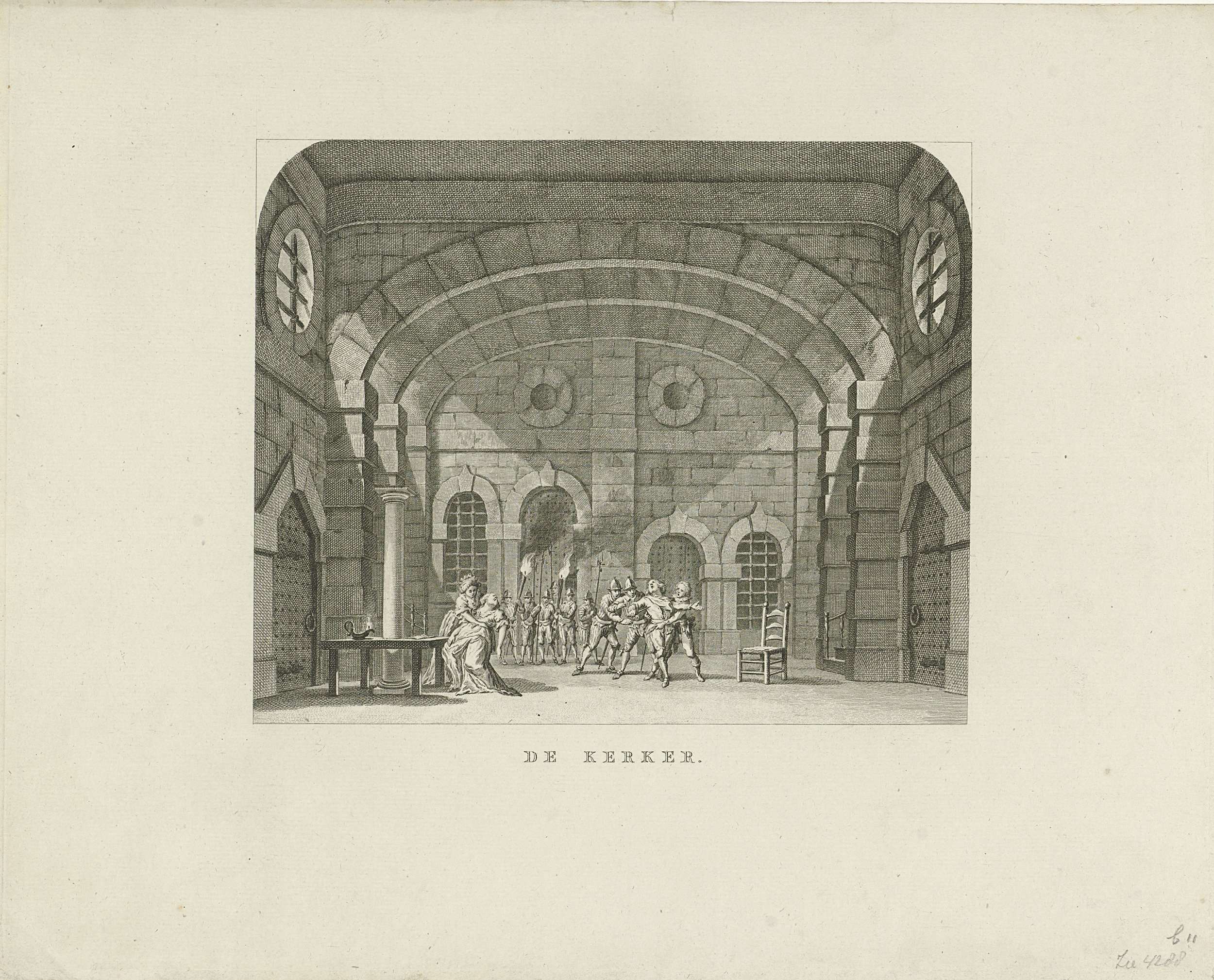 Het coulissendecor De Kerker, met scène uit Gabriëla van Vergij. Aparte afdruk van alleen het decor, zonder de passe-partout met het toneel en de zaal. Behorend bij de serie van veertien toneeldecors van de nieuwe Amsterdamse Schouwburg, 1787-1794.