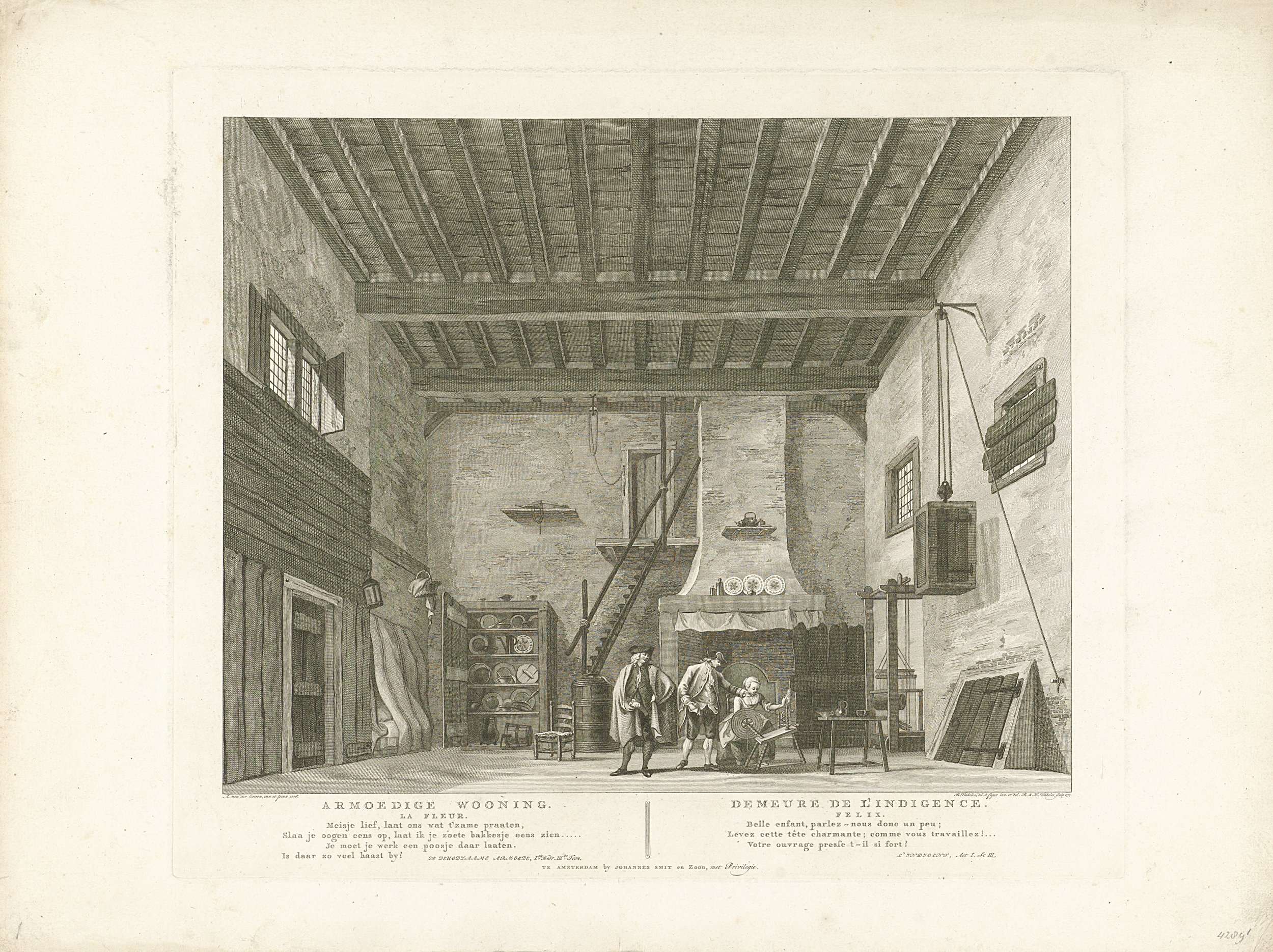Het coulissendecor Armoedige Wooning, met een scène uit: De Deugdzame Armoede. Onderdeel van een serie van zes toneeldecors van toneelstukken opgevoerd in de nieuwe Amsterdamse Schouwburg uit de jaren 1775-1777.