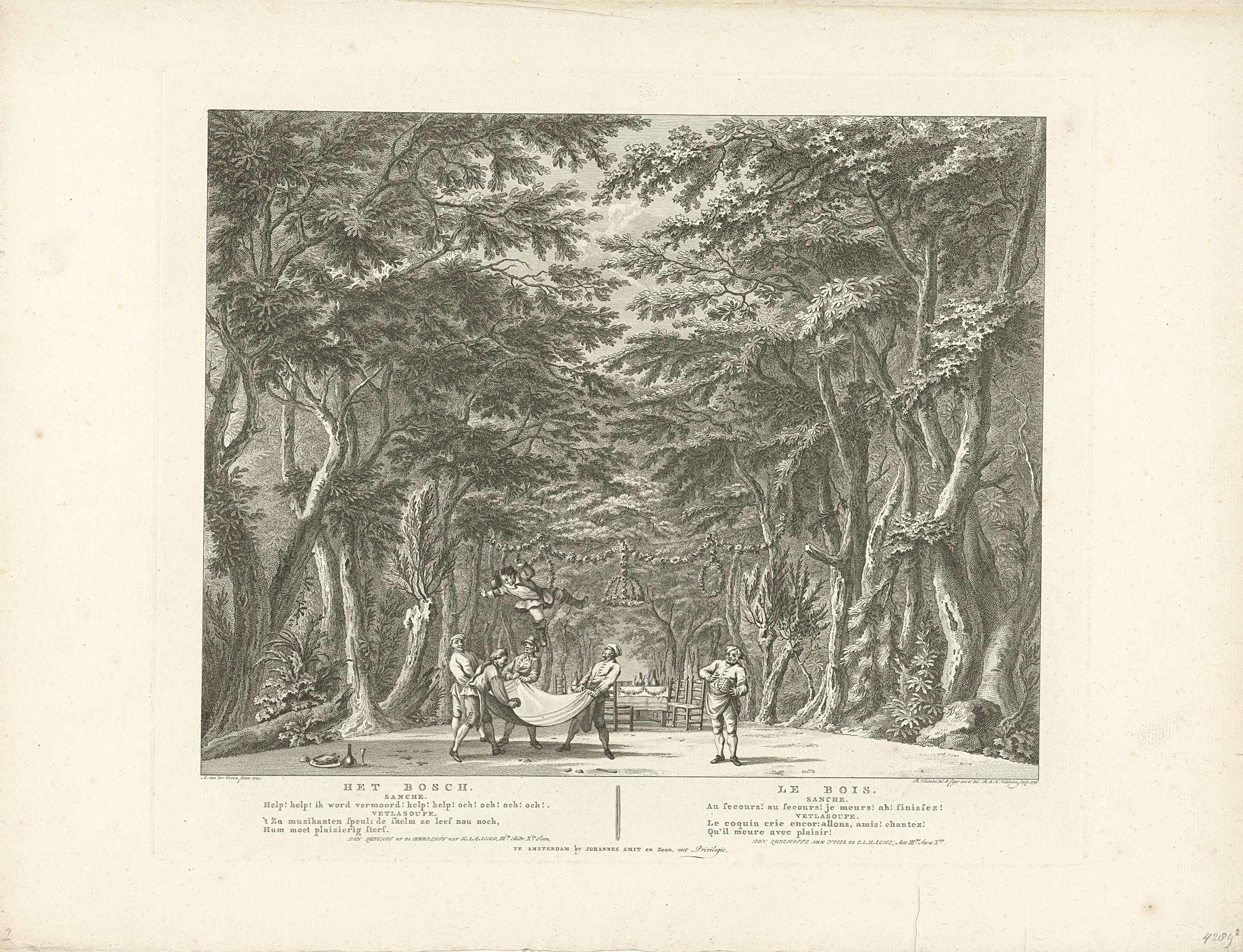 Het coulissendecor Het Bosch, met een scène uit: Don Quichot. Onderdeel van een serie van zes toneeldecors van toneelstukken opgevoerd in de nieuwe Amsterdamse Schouwburg uit de jaren 1775-1777.