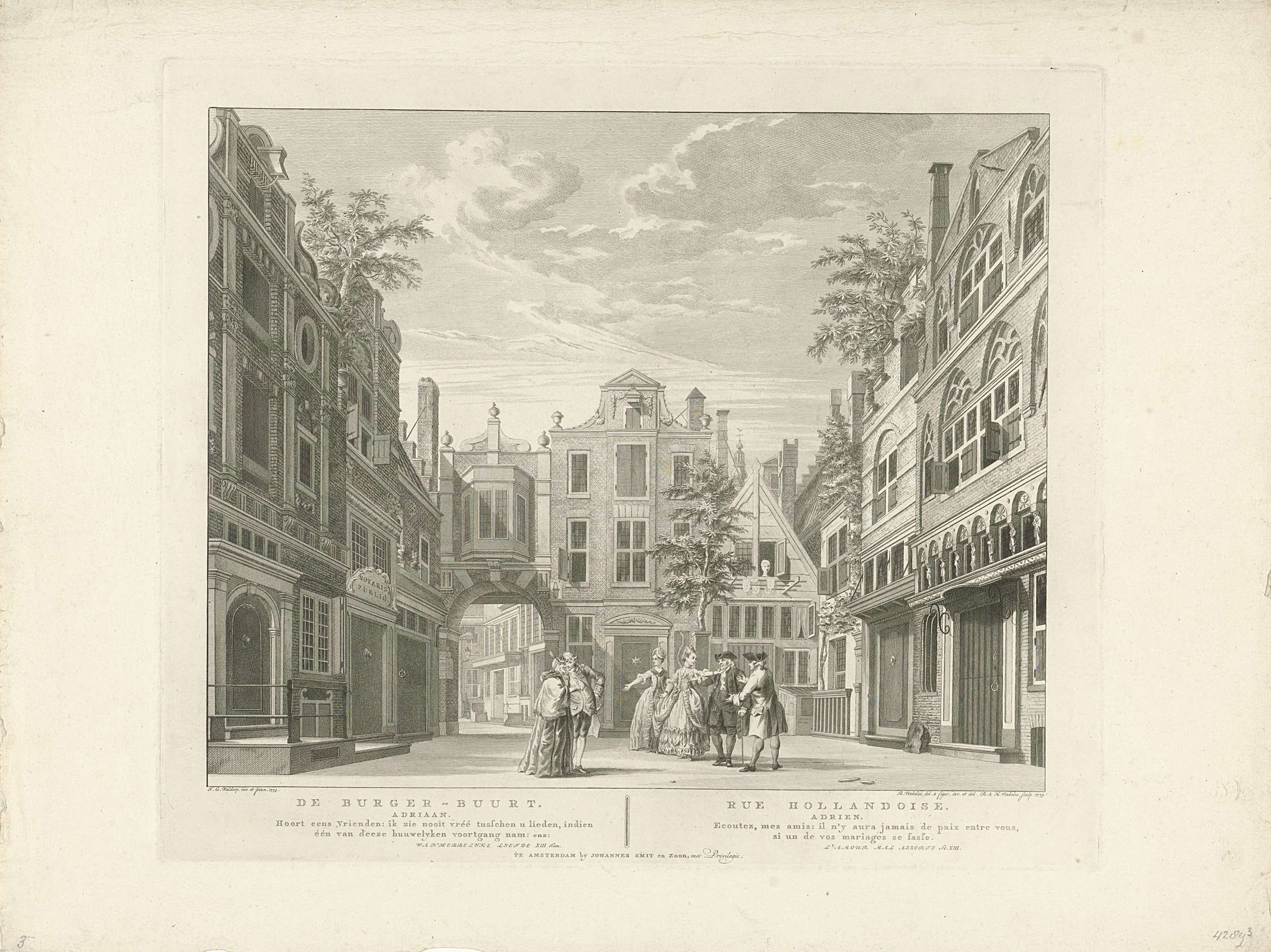 Het coulissendecor De Burger-Buurt, met een scène uit: Wanhebbelijke Liefde. Onderdeel van een serie van zes toneeldecors van toneelstukken opgevoerd in de nieuwe Amsterdamse Schouwburg uit de jaren 1775-1777.