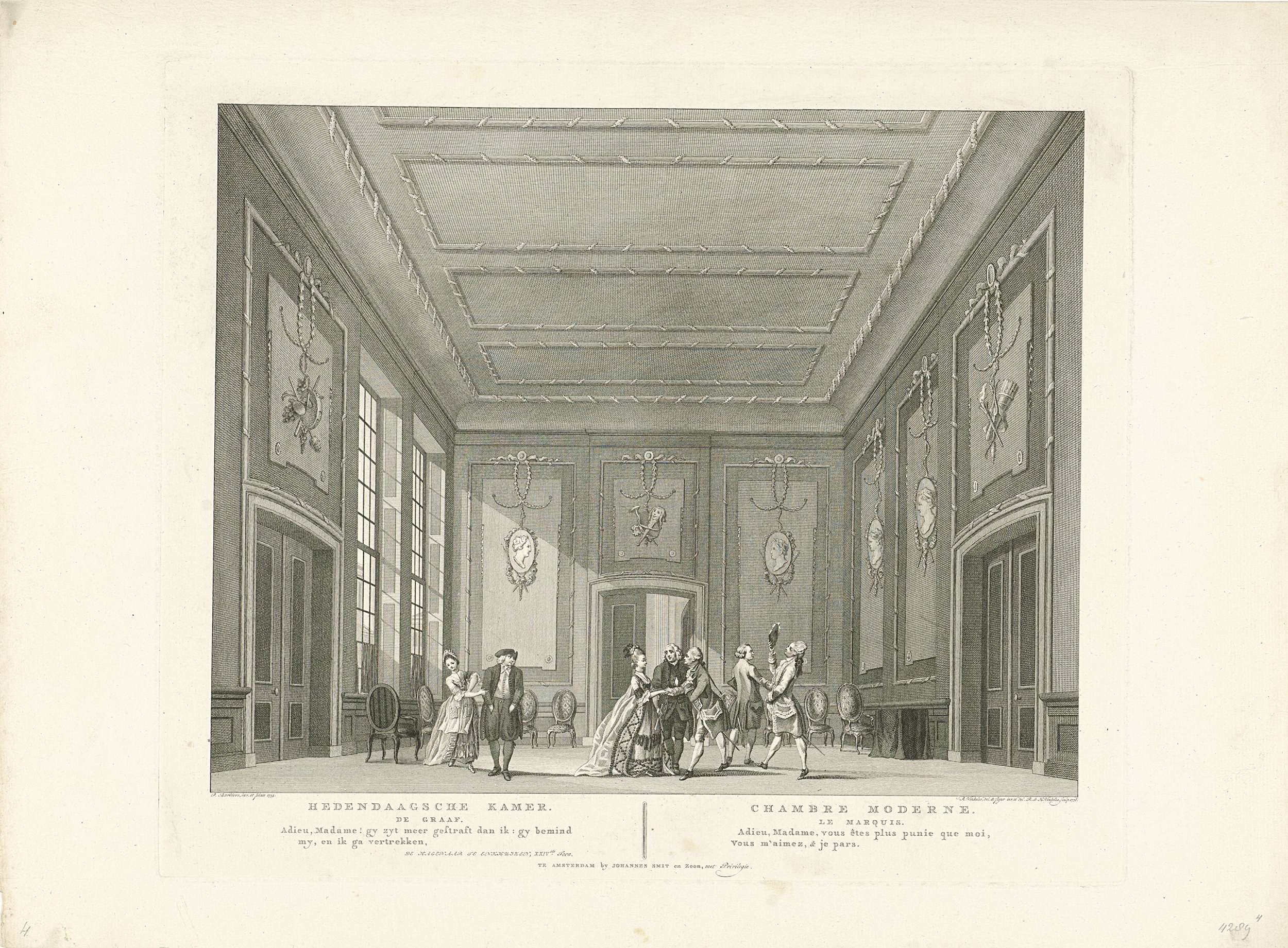 Het coulissendecor Hedendaagsche Kamer, met een scène uit: De Hagenaar te Enkhuizen. Onderdeel van een serie van zes toneeldecors van toneelstukken opgevoerd in de nieuwe Amsterdamse Schouwburg uit de jaren 1775-1777.