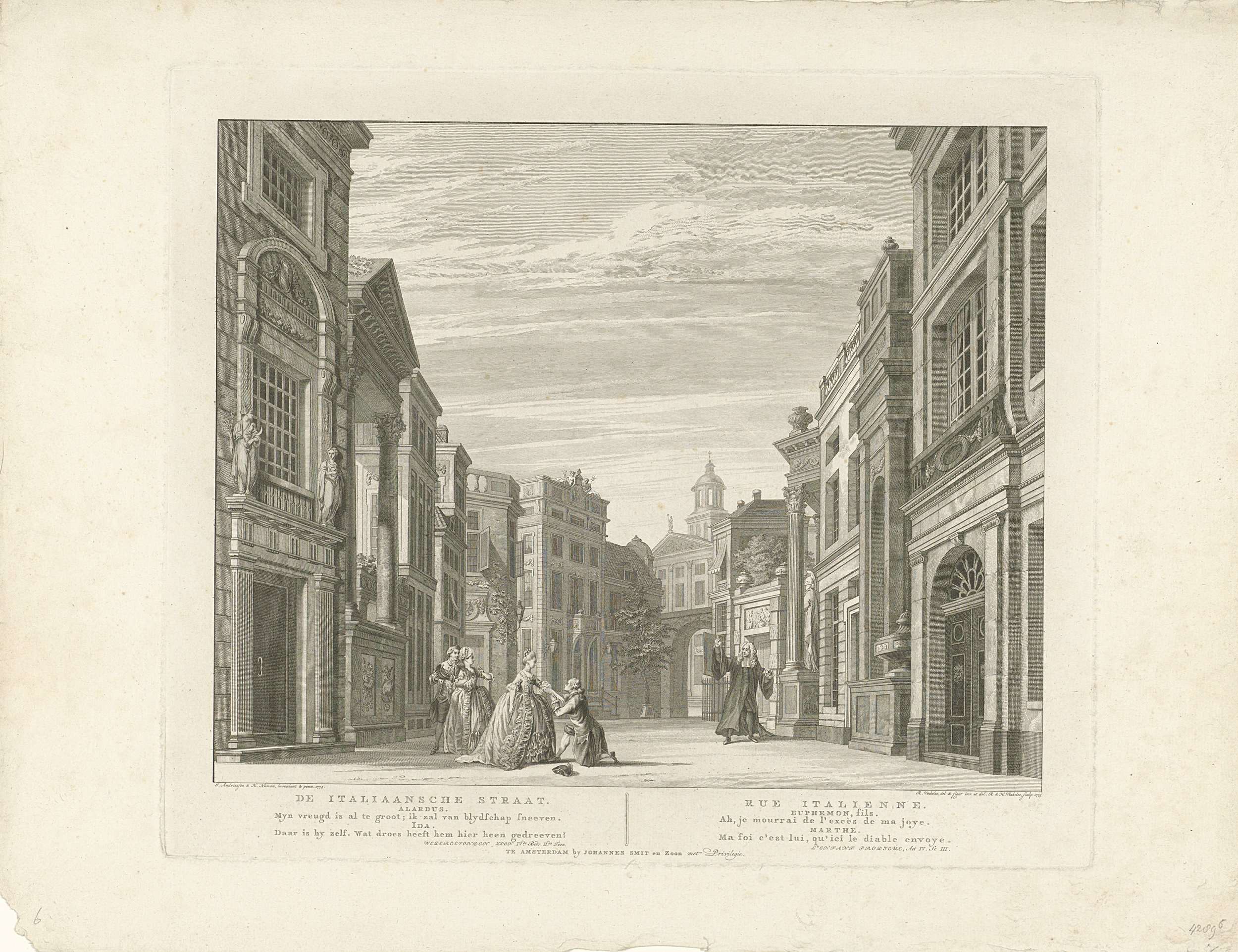 Het coulissendecor De Italiaansche Straat, met een scène uit: Wedergevonden zoon. Onderdeel van een serie van zes toneeldecors van toneelstukken opgevoerd in de nieuwe Amsterdamse Schouwburg uit de jaren 1775-1777.