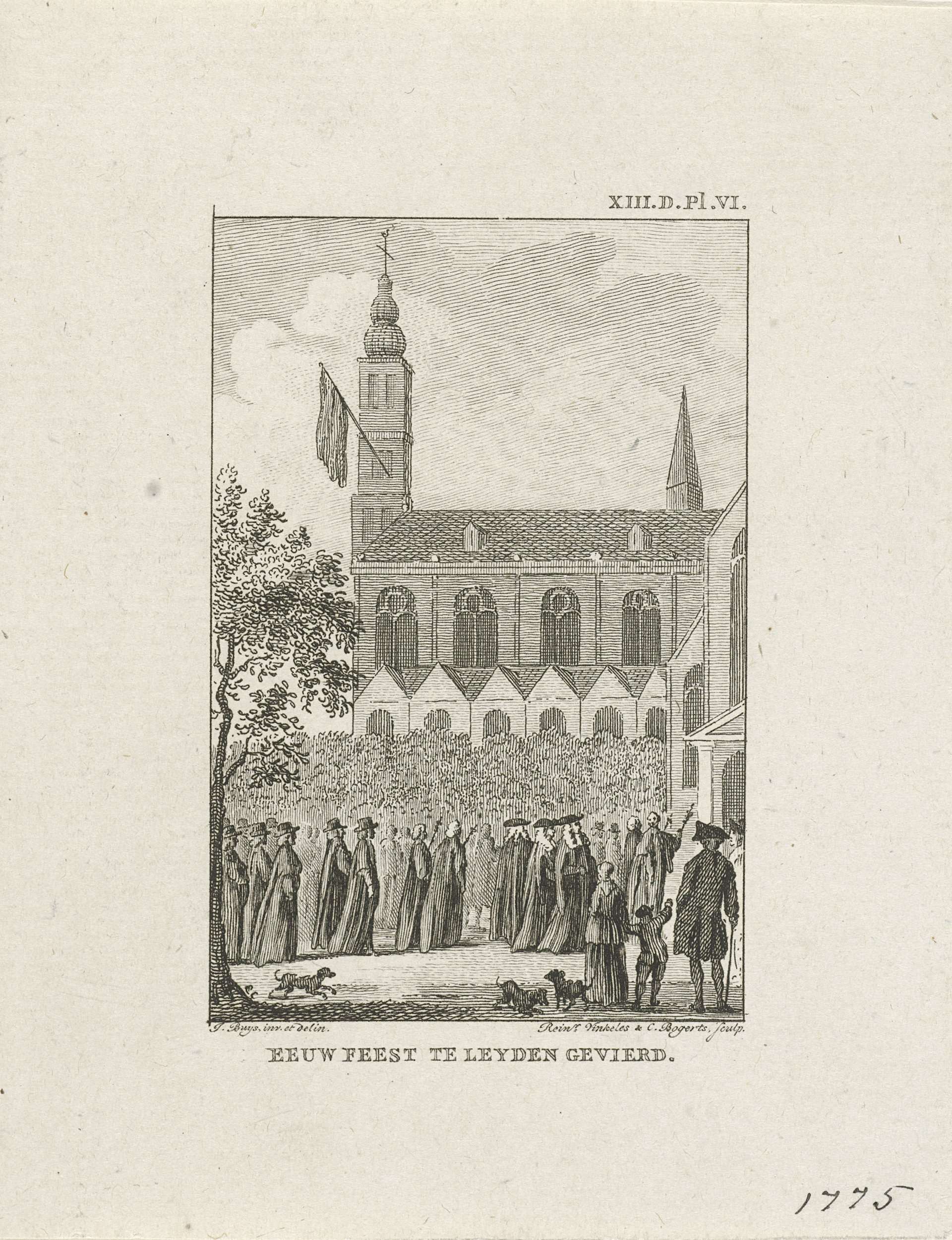 Optocht der hoogleraren bij de viering van het Tweede Eeuwfeest van de oprichting van de Universiteit van Leiden, 8 februari 1775. Op de achtergrond het Academiegebouw te Leiden. Gemerkt rechtsboven: XIII.D.Pl.VI.