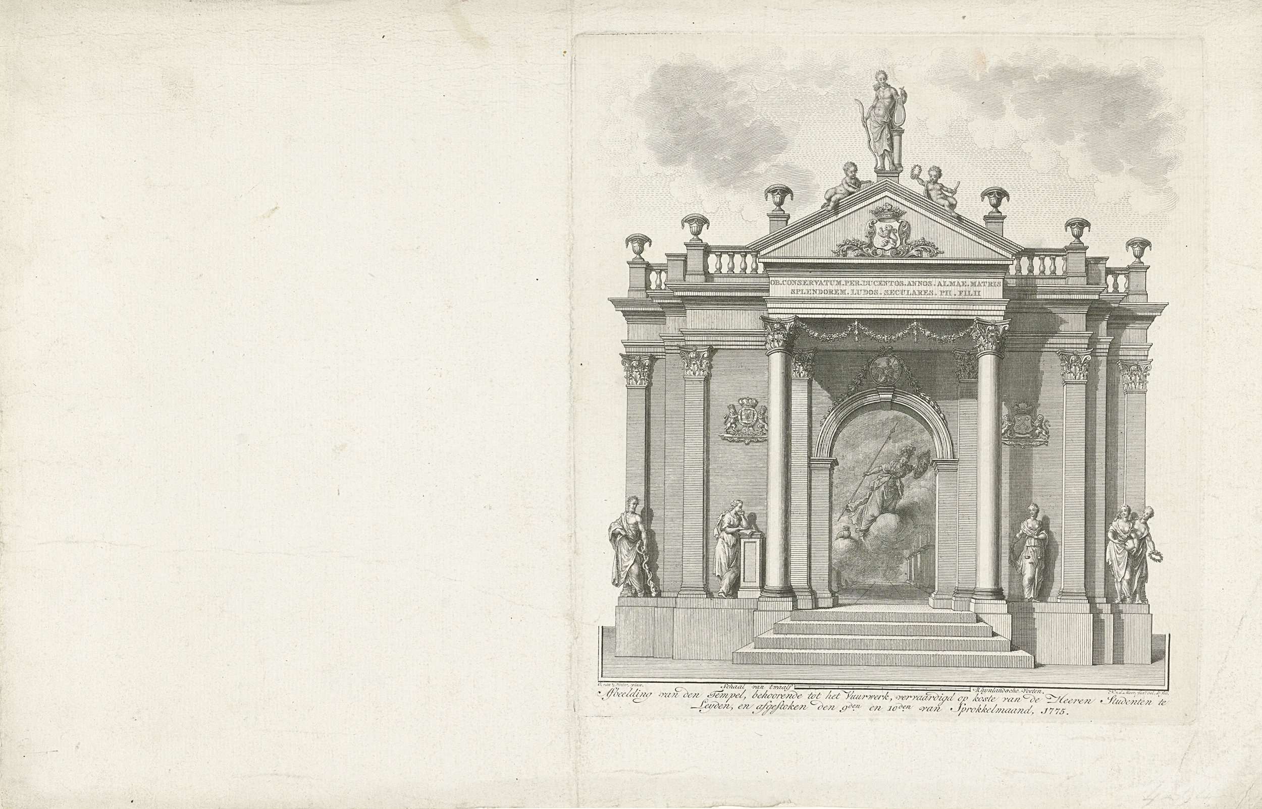 Stellage voor het afsteken van het vuurwerk ter gelegenheid van het Tweede Eeuwfeest van de oprichting van de Universiteit van Leiden, 8 februari 1775. Podium in de vorm van een tempel versierd met allegorische figuren.