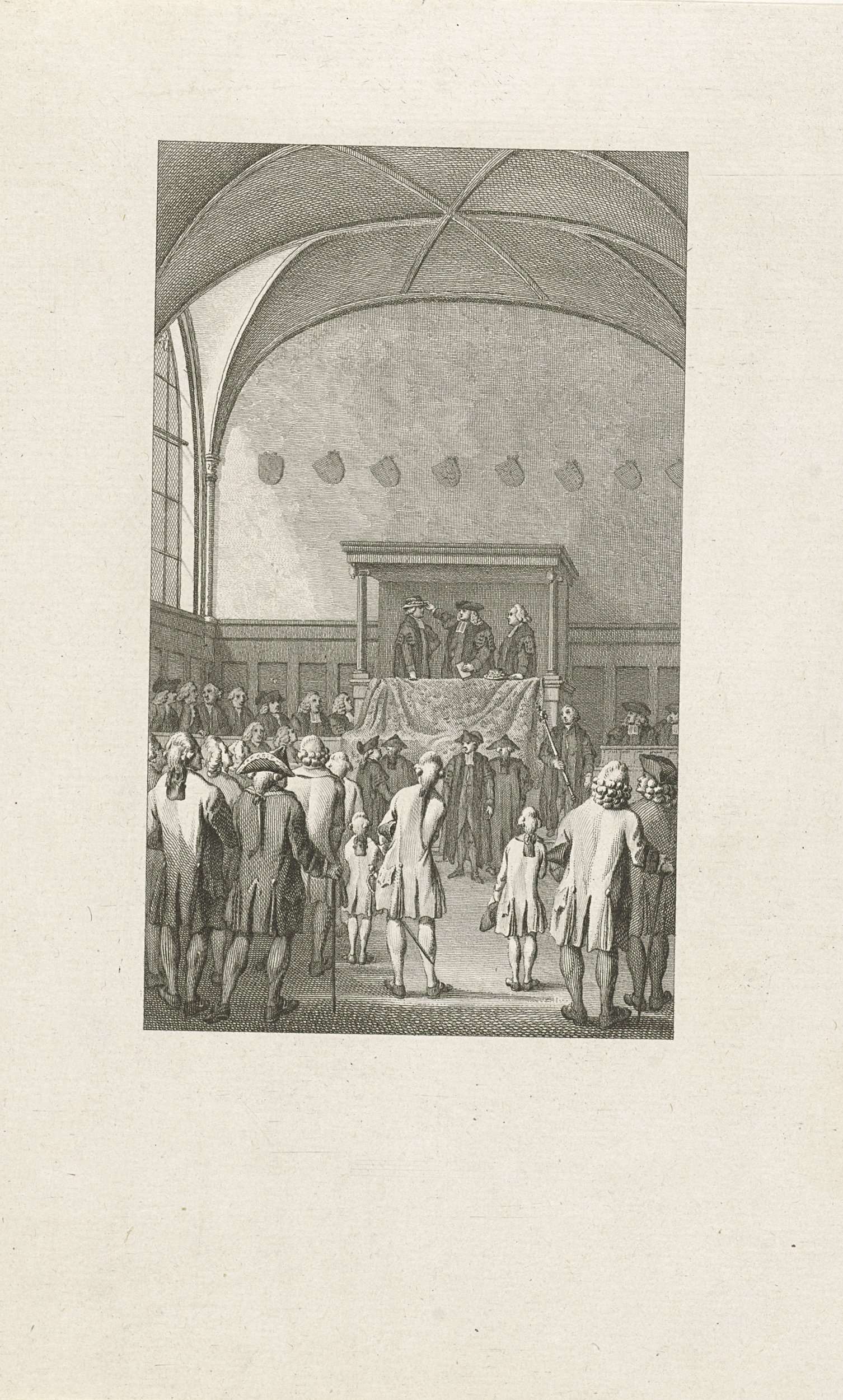 Promotie met de kap in een universiteitszaal bij gelegenheid van het Tweede Eeuwfeest van de oprichting van de Universiteit van Leiden, 9 februari 1775.