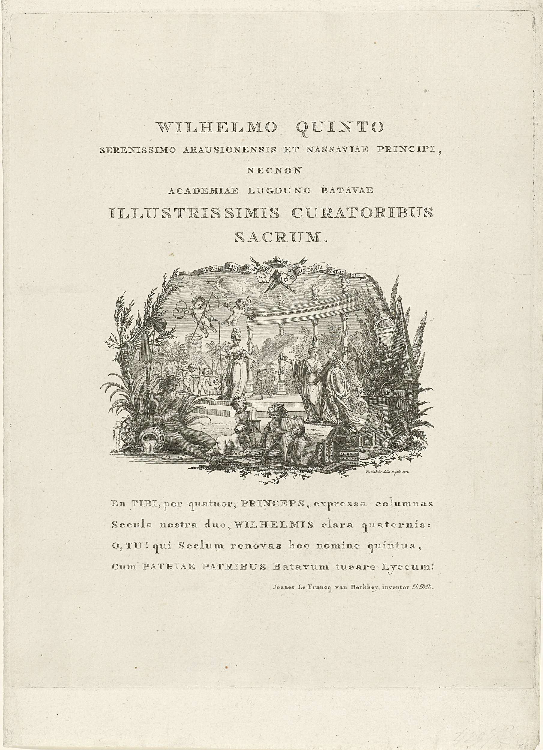 Allegorisch vignet met stadhouder Willem V als beschermheer van de universiteit, bij gelegenheid van het Tweede Eeuwfeest van de oprichting van de Universiteit van Leiden, 8 februari 1775. De stedenmaagd van Leiden begeleidt de prins naar Minerva bij een zuilengalerij op de Burcht. Links de stroomgod van de Rijn, rechts wapentrofee, op de voorgrond kindertjes ...