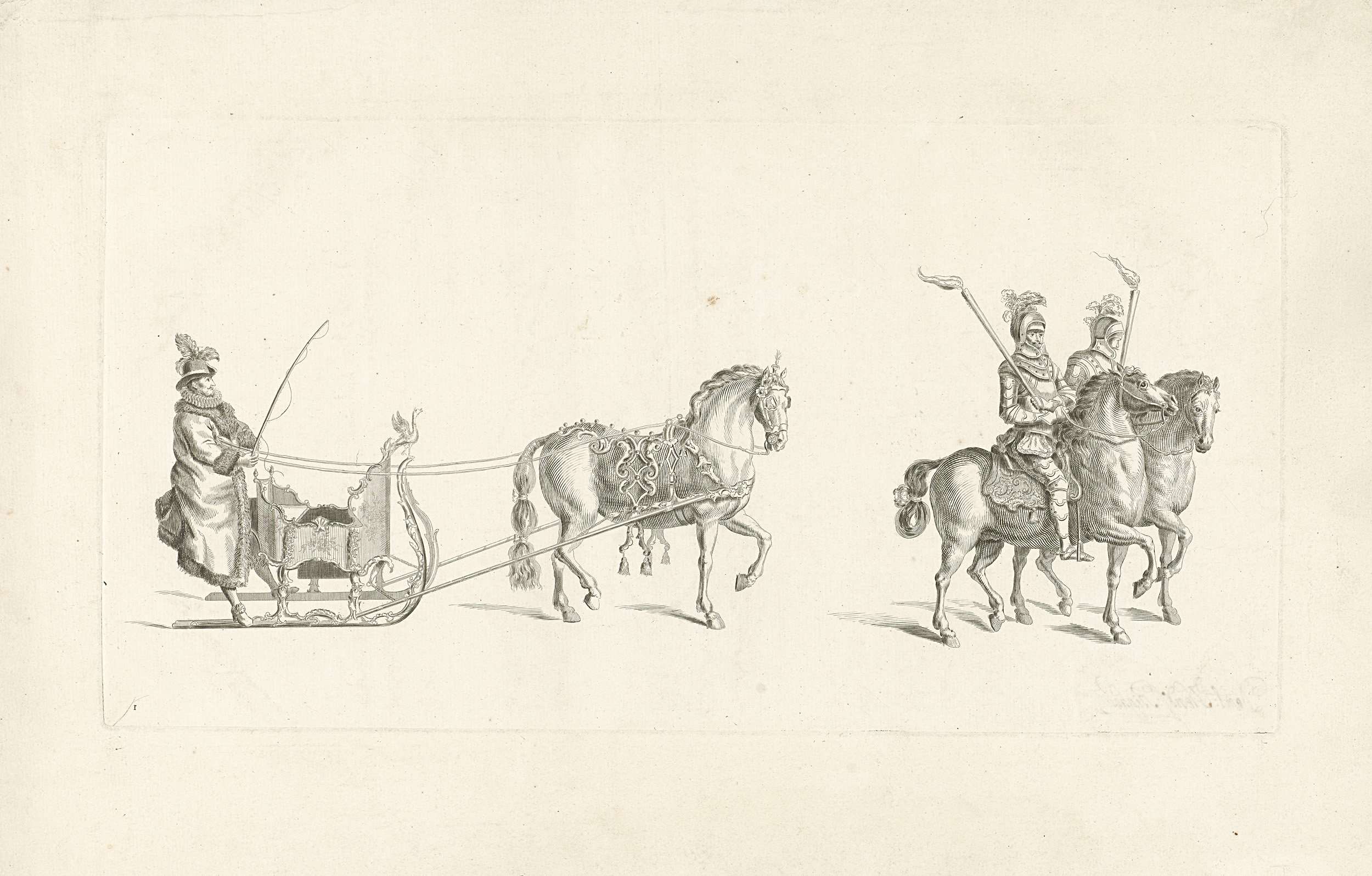 De eerste slede in de optocht. Een Friese slede met een stalmeester voorafgegaan door twee ruiters in harnas met toortsen. Onderdeel van een reeks van twaalf platen van de sledevaart op 24 januari 1776 georganiseerd door het Leidse genootschap Veniam Pro Laude bij gelegenheid van het Tweede Eeuwfeest van het Leids Ontzet (3 oktober 1574) ...