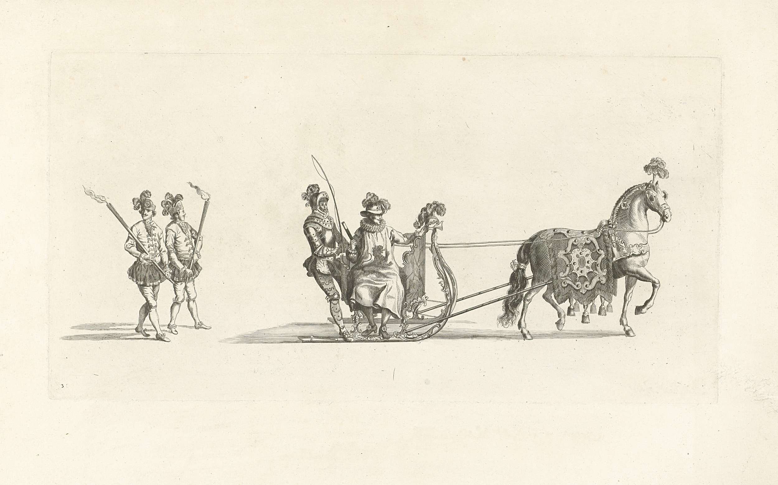 De derde slede in de optocht. Een slede waarin een ridder en een wapenheraut, getrokken door een paard en gevolgd door twee hardlopers met toortsen. Onderdeel van een reeks van twaalf platen van de sledevaart op 24 januari 1776 georganiseerd door het Leidse genootschap Veniam Pro Laude bij gelegenheid van het Tweede Eeuwfeest van het ...