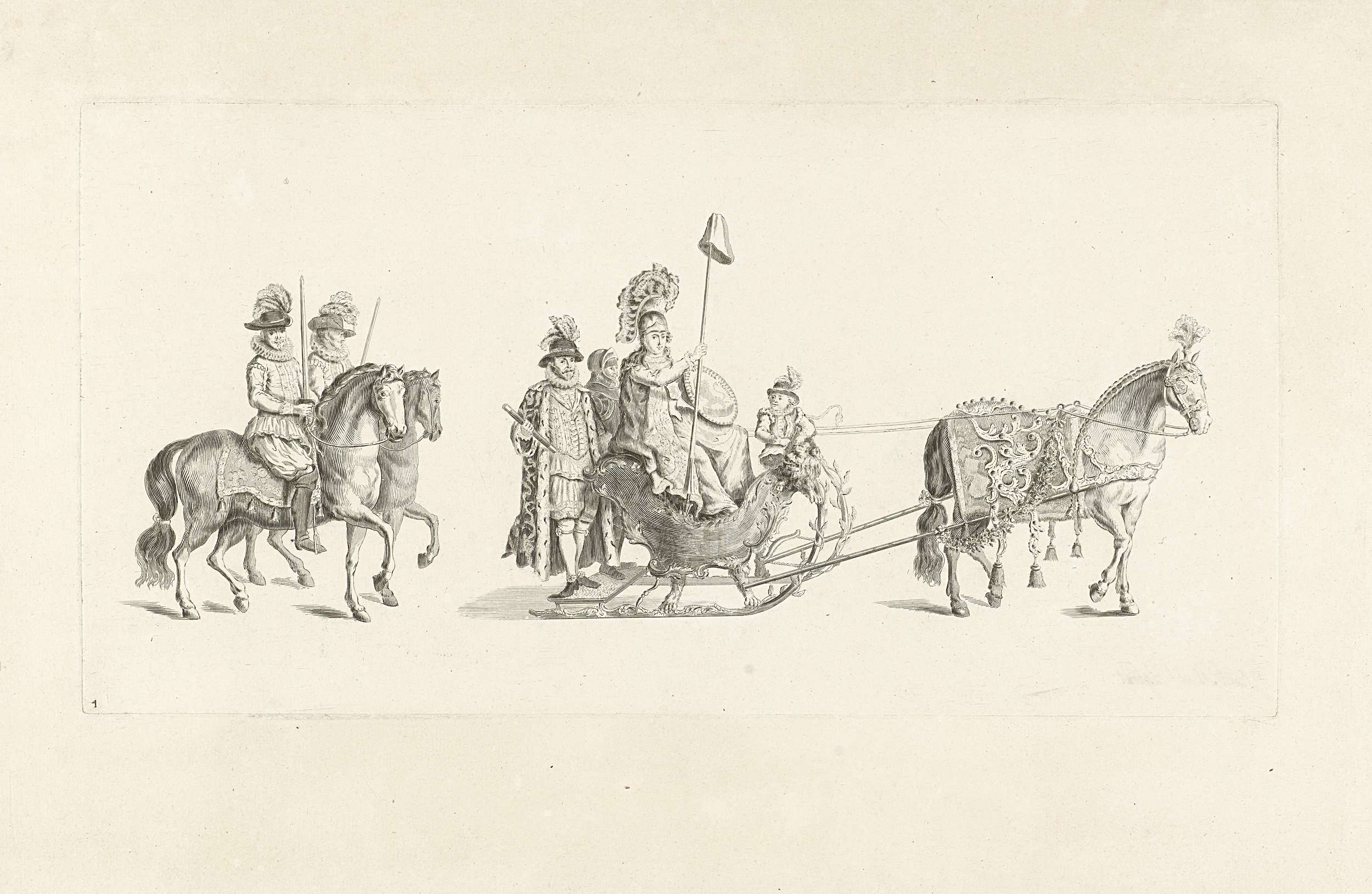De vierde slede in de optocht. Een slede waarin de personificatie van de Vrijheid, met Willem van Oranje en een ridder, getrokken door een paard en gevolgd door edelen te paard. Onderdeel van een reeks van twaalf platen van de sledevaart op 24 januari 1776 georganiseerd door het Leidse genootschap Veniam Pro Laude bij gelegenheid ...