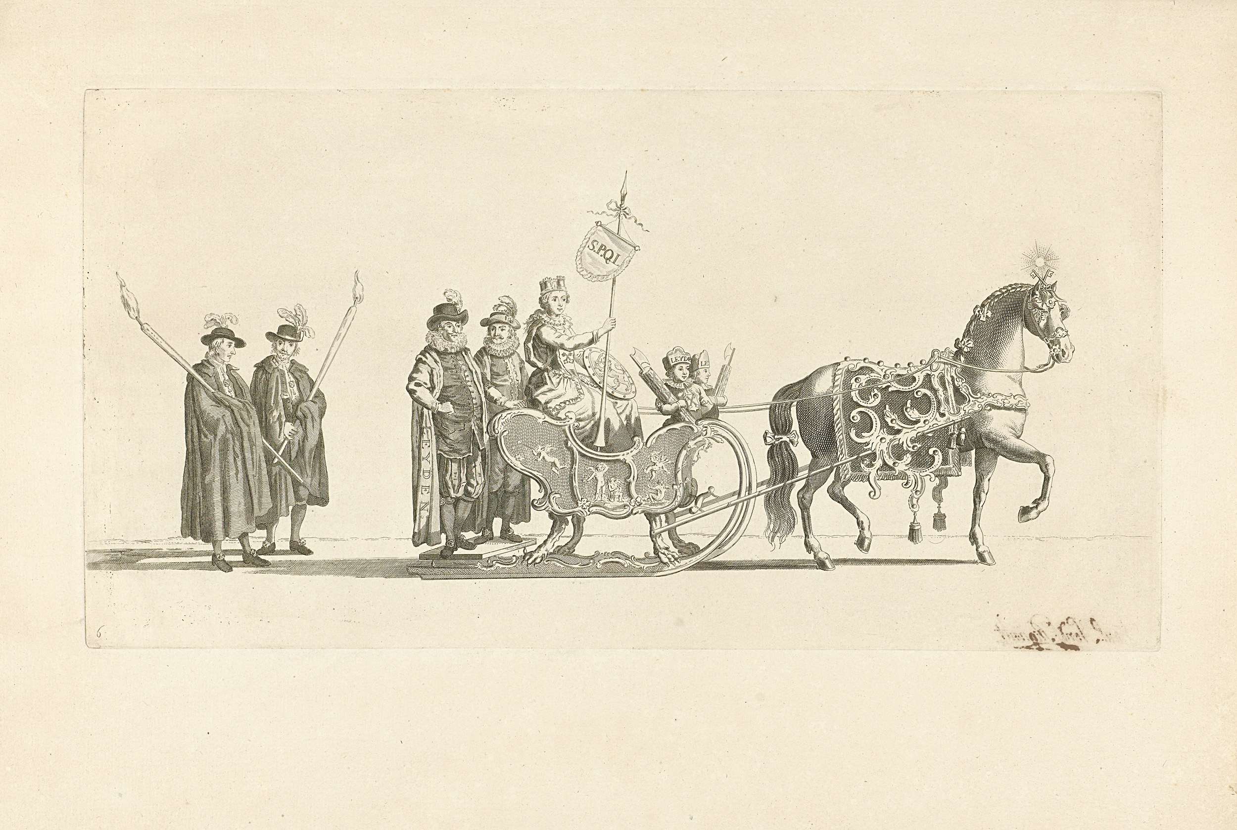 De zesde slede in de optocht. Een slede met de stadsmaagd van Leiden, getrokken door een paard en gevolgd door twee stadsboden te voet. Onderdeel van een reeks van twaalf platen van de sledevaart op 24 januari 1776 georganiseerd door het Leidse genootschap Veniam Pro Laude bij gelegenheid van het Tweede Eeuwfeest van het Leids ...