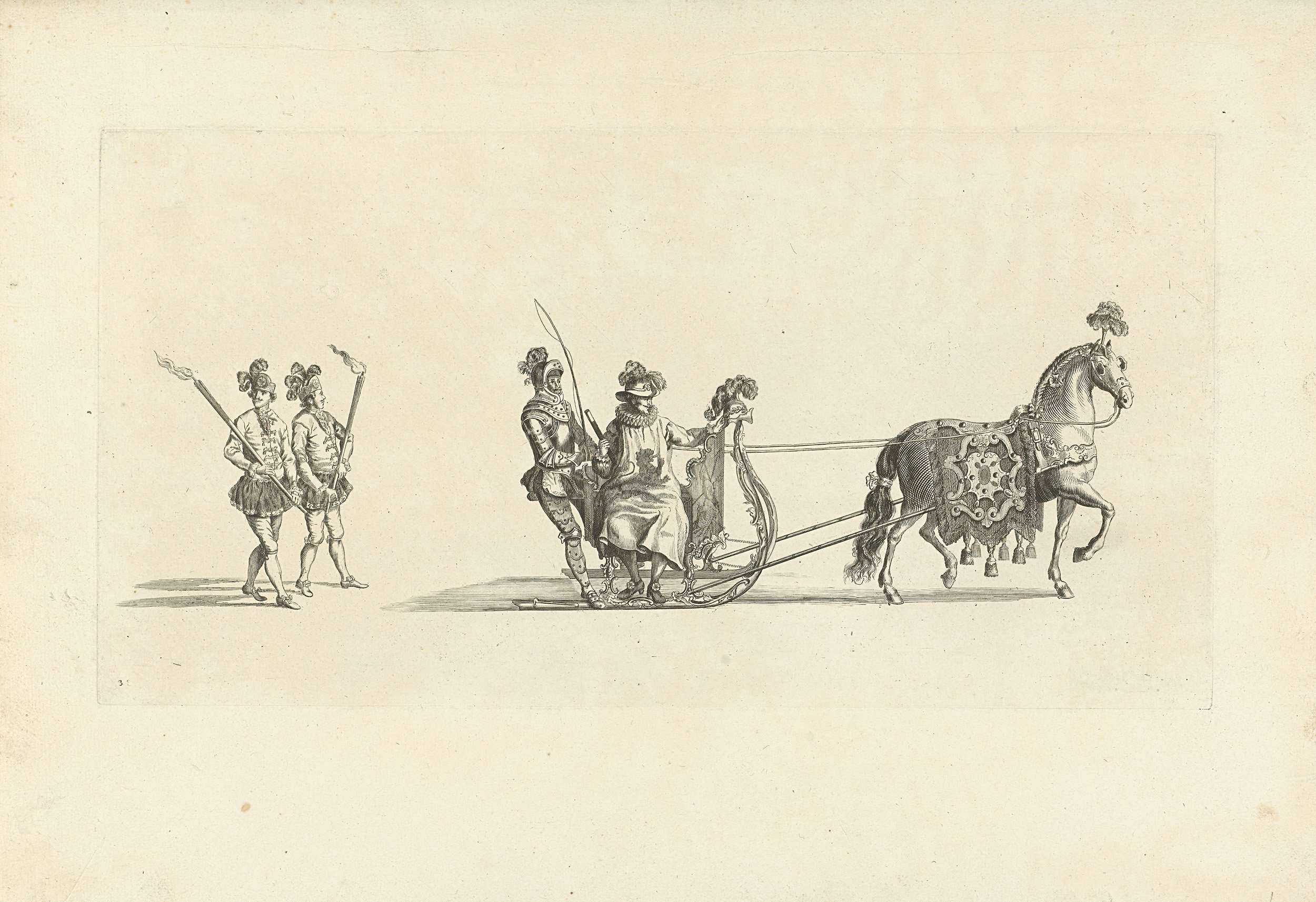 De derde slede in de optocht. Een slede waarin een ridder en een wapenheraut, getrokken door een paard en gevolgd door twee hardlopers met toortsen. Onderdeel van een reeks van twaalf platen van de sledevaart op 24 januari 1776 georganiseerd door het Leidse genootschap Veniam Pro Laude bij gelegenheid van het Tweede Eeuwfeest van het ...