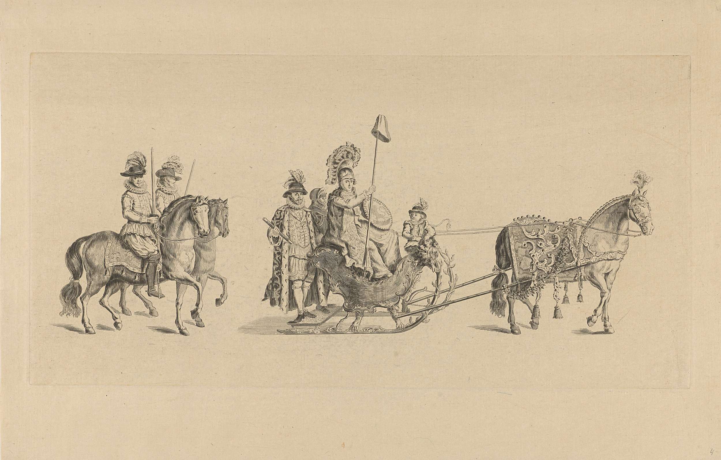 De vierde slede in de optocht. Een slede waarin de personificatie van de Vrijheid, met Willem van Oranje en een ridder, getrokken door een paard en gevolgd door edelen te paard. Onderdeel van een reeks van twaalf platen (vóór het nummer en op ander papier) van de sledevaart op 24 januari 1776 georganiseerd door het ...