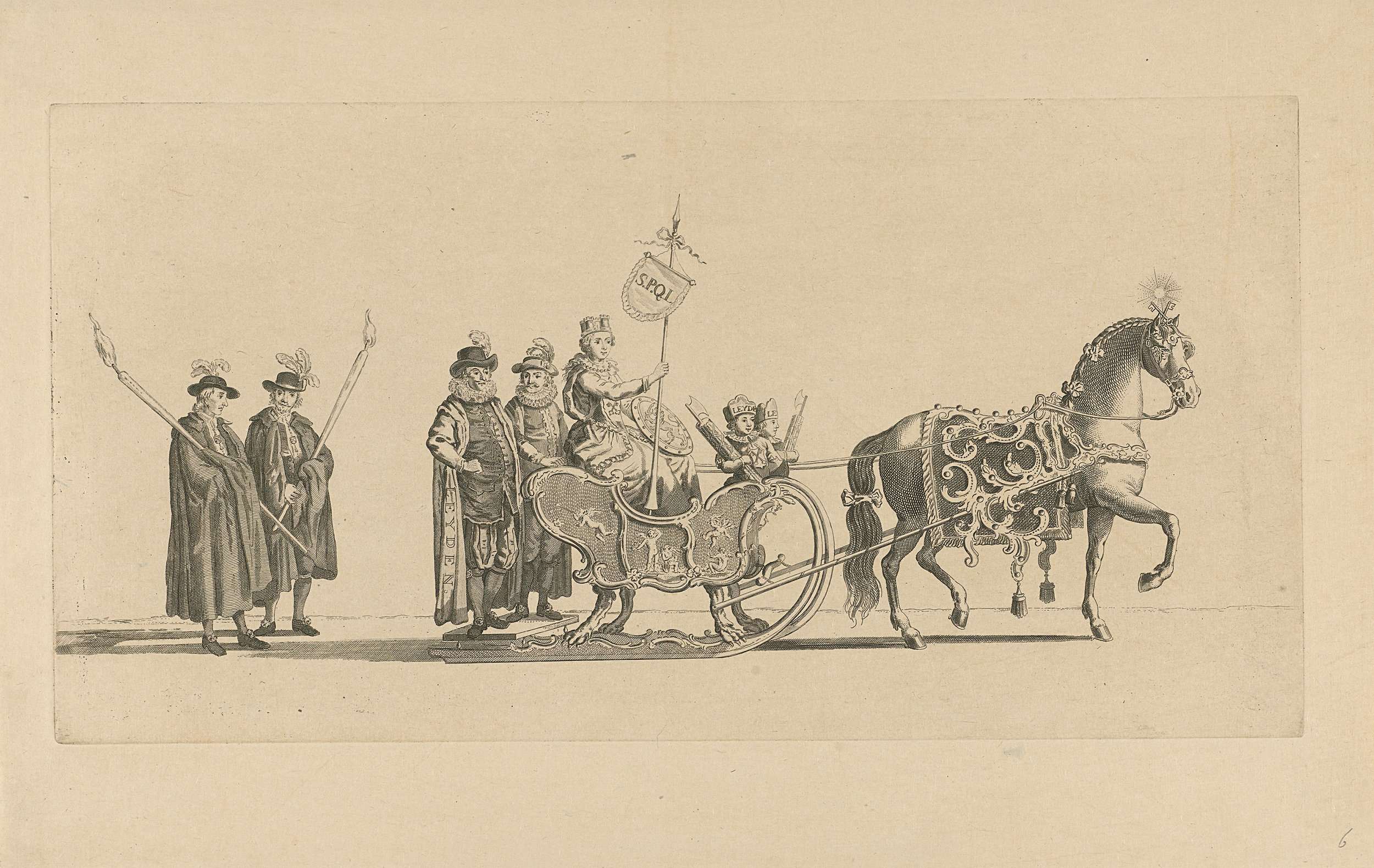 De zesde slede in de optocht. Een slede met de stadsmaagd van Leiden, getrokken door een paard en gevolgd door twee stadsboden te voet. Onderdeel van een reeks van twaalf platen (vóór het nummer en op ander papier) van de sledevaart op 24 januari 1776 georganiseerd door het Leidse genootschap Veniam Pro Laude bij gelegenheid ...