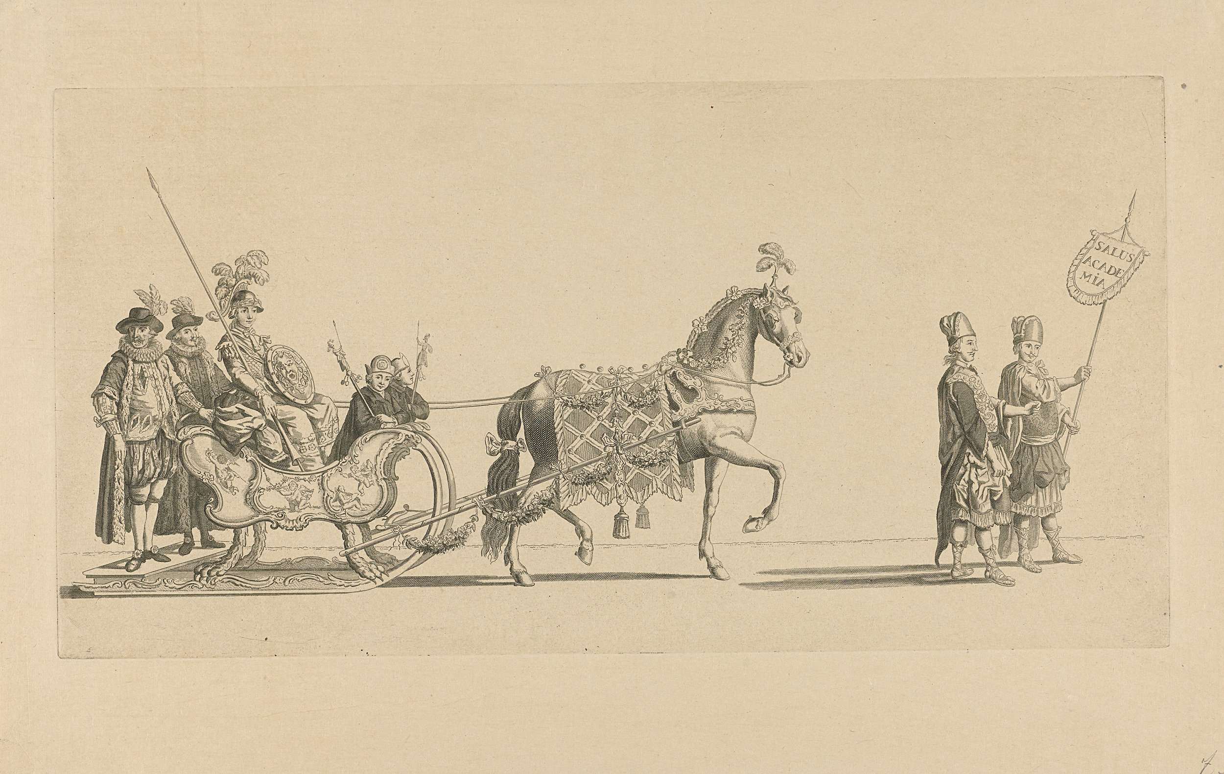 De zevende slede in de optocht. Een slede met Minerva getrokken door een paard en voorafgegaan door twee personen in Griekse kleding. Onderdeel van een reeks van twaalf platen (vóór het nummer en op ander papier) van de sledevaart op 24 januari 1776 georganiseerd door het Leidse genootschap Veniam Pro Laude bij gelegenheid van het ...