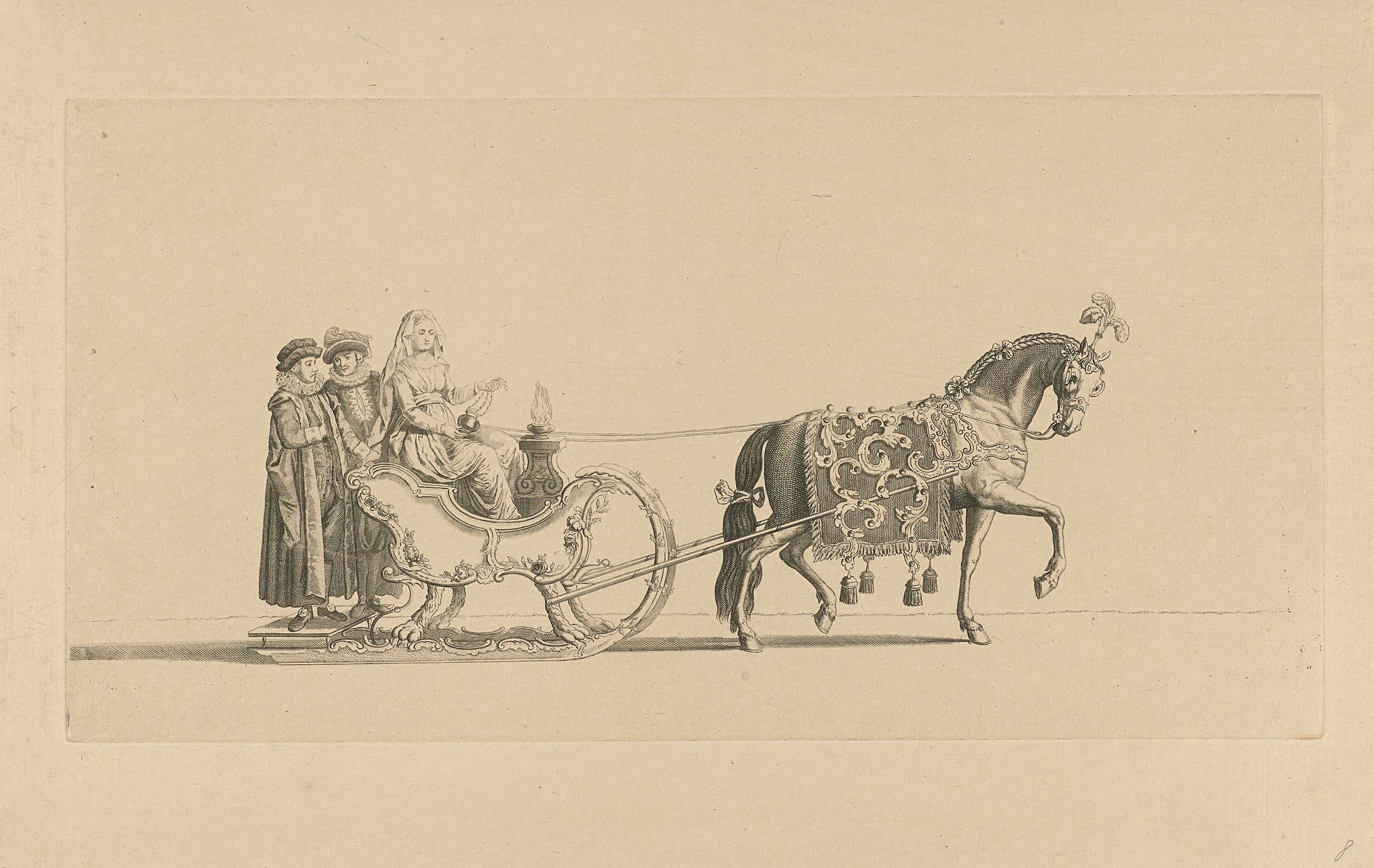 De achtste slede in de optocht. Een slede met de personificatie van de Godsdienst, getrokken door een paard. Onderdeel van een reeks van twaalf platen (vóór het nummer en op ander papier) van de sledevaart op 24 januari 1776 georganiseerd door het Leidse genootschap Veniam Pro Laude bij gelegenheid van het Tweede Eeuwfeest van het ...