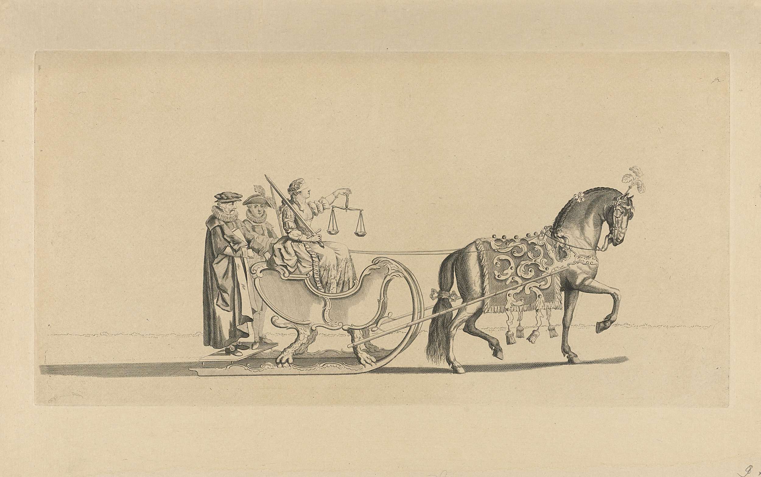 De negende slede in de optocht. Een slede met de personificatie van de Rechtvaardigheid, getrokken door een paard. Onderdeel van een reeks van twaalf platen (vóór het nummer en op ander papier) van de sledevaart op 24 januari 1776 georganiseerd door het Leidse genootschap Veniam Pro Laude bij gelegenheid van het Tweede Eeuwfeest van het ...