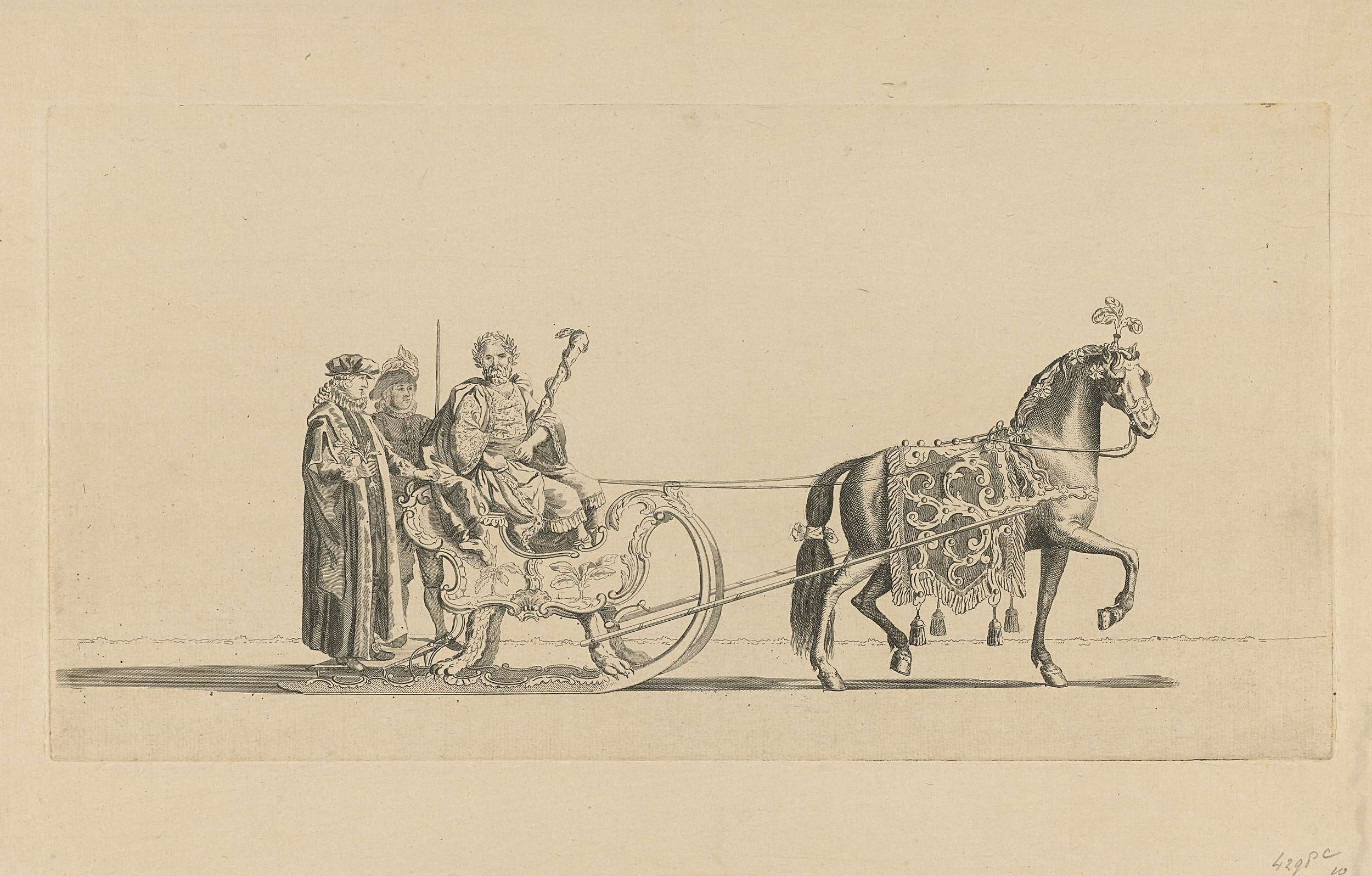 De tiende slede in de optocht. Een slede met Asclepius (Aesculapius), getrokken door een paard. Onderdeel van een reeks van twaalf platen (vóór het nummer en op ander papier) van de sledevaart op 24 januari 1776 georganiseerd door het Leidse genootschap Veniam Pro Laude bij gelegenheid van het Tweede Eeuwfeest van het Leids Ontzet (3 ...