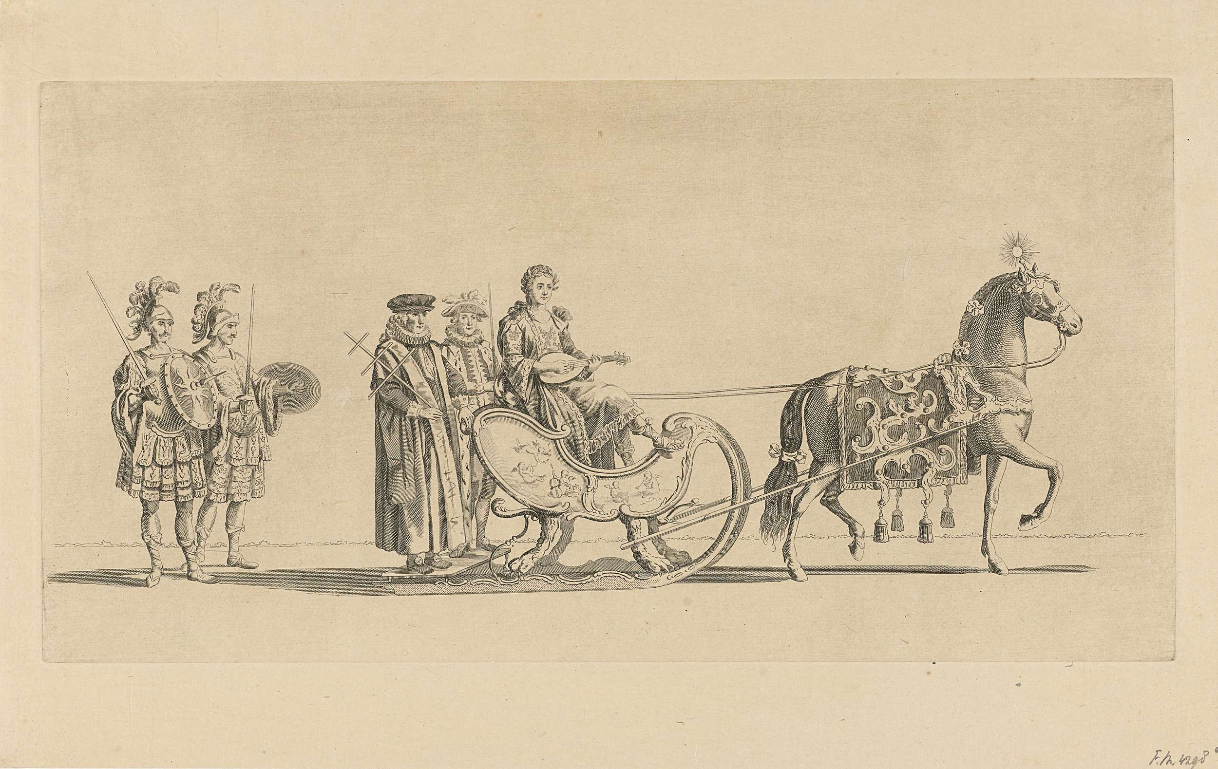 De elfde slede in de optocht. Een slede met de personificatie van de Muziek, getrokken door een paard, gevolgd door twee Romeinse soldaten. Onderdeel van een reeks van twaalf platen (vóór het nummer en op ander papier) van de sledevaart op 24 januari 1776 georganiseerd door het Leidse genootschap Veniam Pro Laude bij gelegenheid van ...