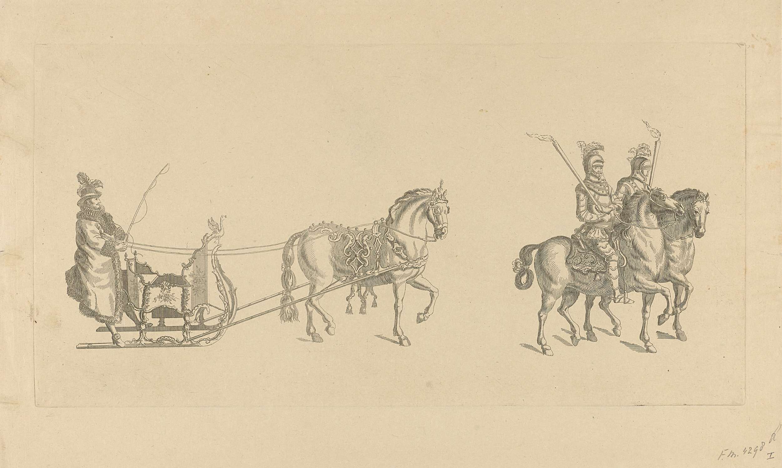 De eerste slede in de optocht. Een Friese slede met een stalmeester voorafgegaan door twee ruiters in harnas met toortsen. Onderdeel van een reeks van twaalf platen (etsdruk vóór het nummer en op ander papier) van de sledevaart op 24 januari 1776 georganiseerd door het Leidse genootschap Veniam Pro Laude bij gelegenheid van het Tweede ...