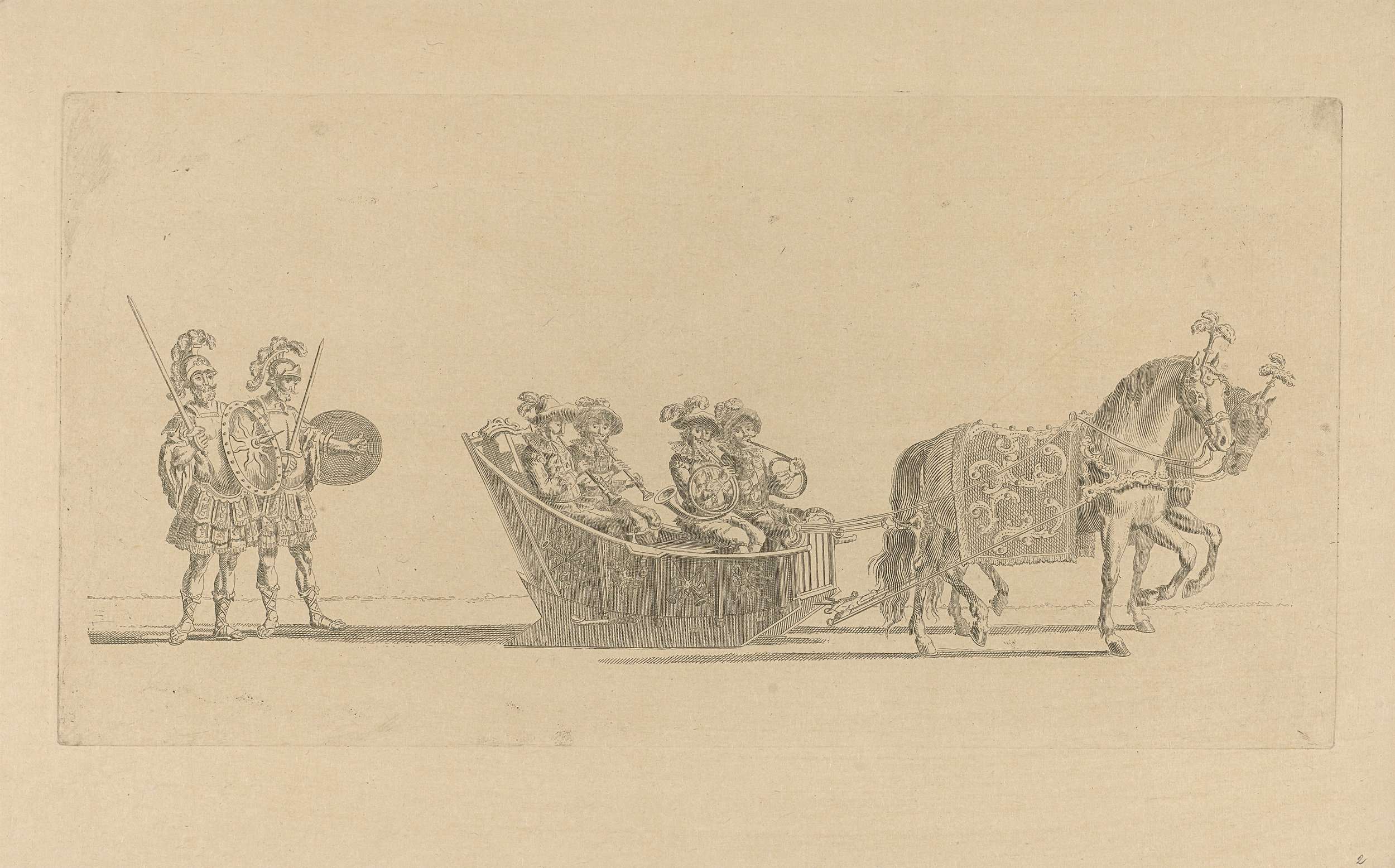 De tweede slede in de optocht. Een grote slede met vier muzikanten getrokken door twee paarden en gevolgd door twee Romeinen met zwaarden. Onderdeel van een reeks van twaalf platen (etsdruk vóór het nummer en op ander papier) van de sledevaart op 24 januari 1776 georganiseerd door het Leidse genootschap Veniam Pro Laude bij gelegenheid ...