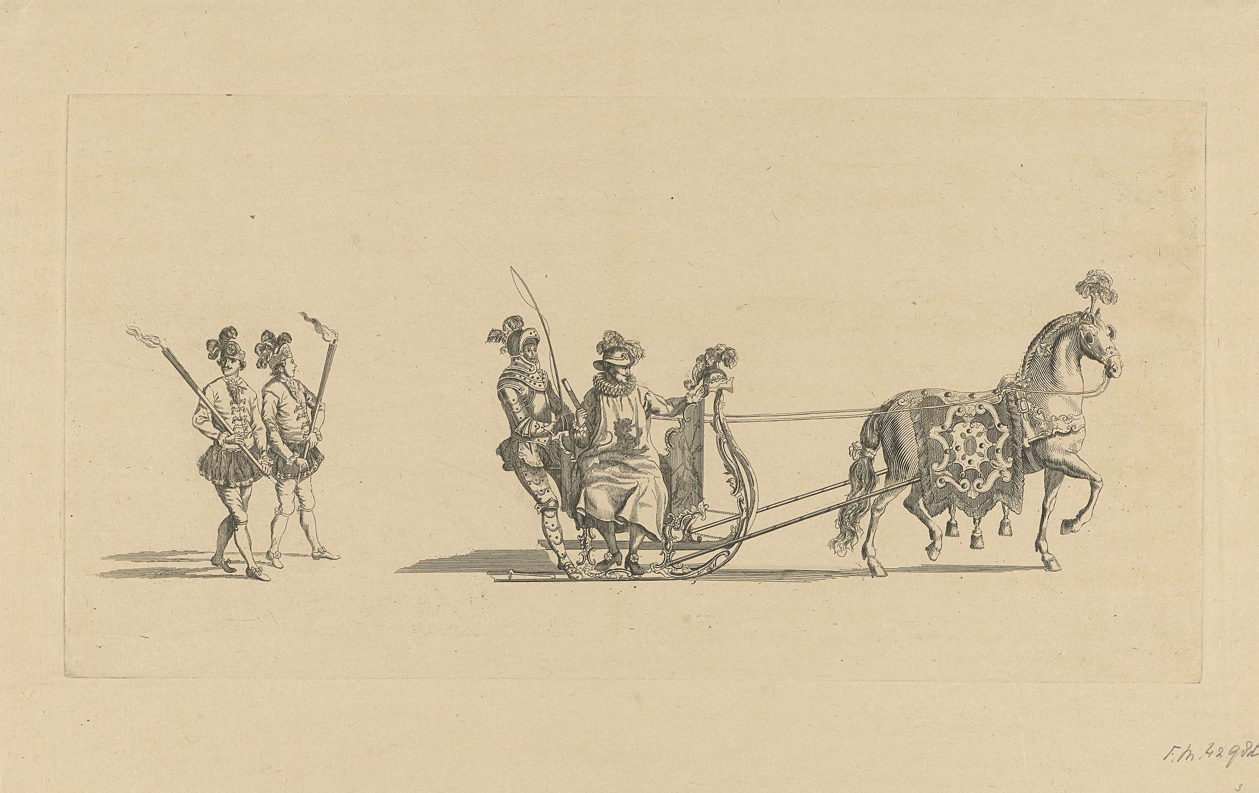 De derde slede in de optocht. Een slede waarin een ridder en een wapenheraut, getrokken door een paard en gevolgd door twee hardlopers met toortsen. Onderdeel van een reeks van twaalf platen (etsdruk vóór het nummer en op ander papier) van de sledevaart op 24 januari 1776 georganiseerd door het Leidse genootschap Veniam Pro Laude ...