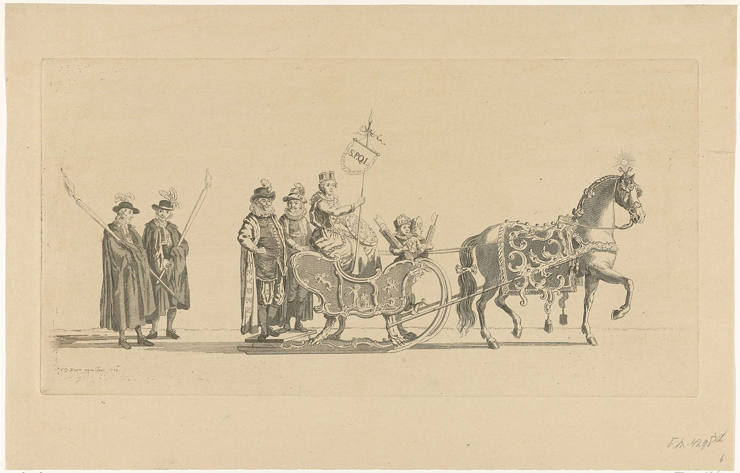 De zesde slede in de optocht. Een slede met de stadsmaagd van Leiden, getrokken door een paard en gevolgd door twee stadsboden te voet. Onderdeel van een reeks van twaalf platen (etsdruk vóór het nummer en op ander papier) van de sledevaart op 24 januari 1776 georganiseerd door het Leidse genootschap Veniam Pro Laude bij ...