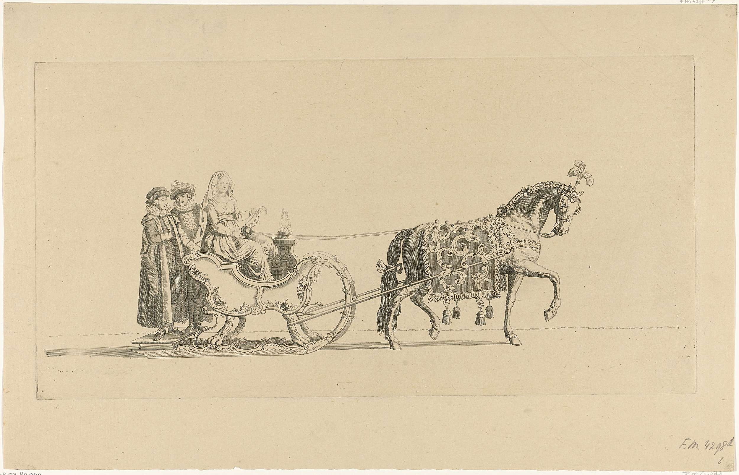 De achtste slede in de optocht. Een slede met de personificatie van de Godsdienst, getrokken door een paard. Onderdeel van een reeks van twaalf platen (etsdruk vóór het nummer en op ander papier) van de sledevaart op 24 januari 1776 georganiseerd door het Leidse genootschap Veniam Pro Laude bij gelegenheid van het Tweede Eeuwfeest van ...