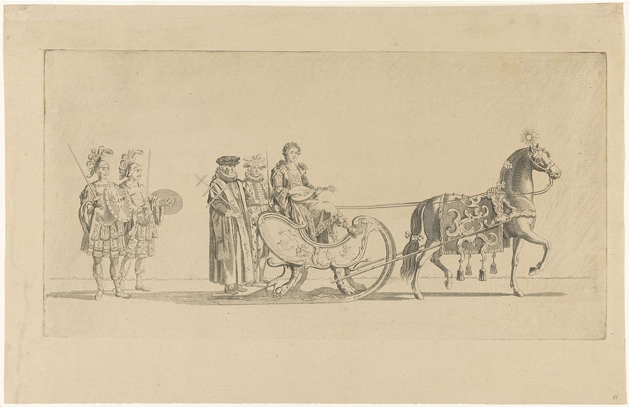 De elfde slede in de optocht. Een slede met de personificatie van de Muziek, getrokken door een paard, gevolgd door twee Romeinse soldaten. Onderdeel van een reeks van twaalf platen (etsdruk vóór het nummer en op ander papier) van de sledevaart op 24 januari 1776 georganiseerd door het Leidse genootschap Veniam Pro Laude bij gelegenheid ...