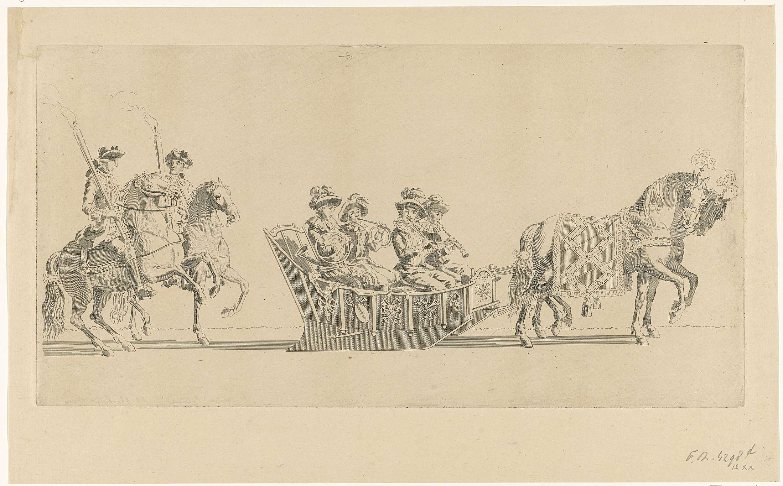 De twaalfde slede in de optocht. Een slede met vier muzikanten, getrokken door een paard, gevolgd door twee ruiters met toortsen. Onderdeel van een reeks van twaalf platen (etsdruk vóór het nummer en op ander papier) van de sledevaart op 24 januari 1776 georganiseerd door het Leidse genootschap Veniam Pro Laude bij gelegenheid van het ...