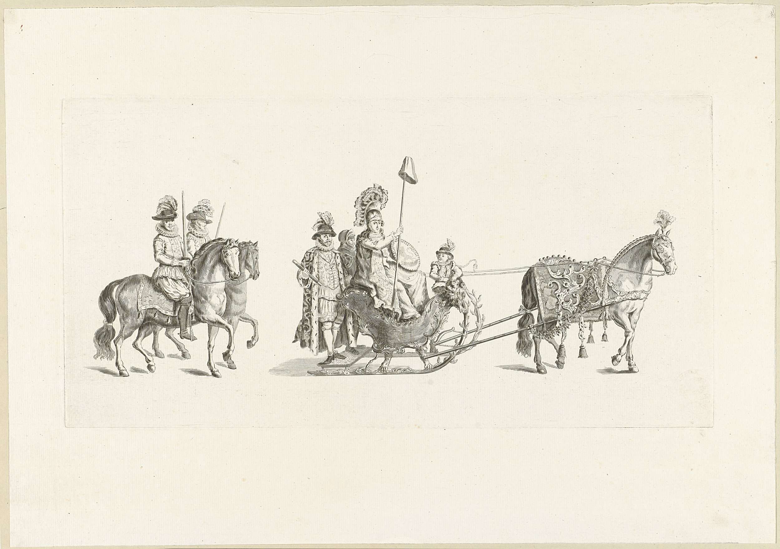 De vierde slede in de optocht. Een slede waarin de personificatie van de Vrijheid, met Willem van Oranje en een ridder, getrokken door een paard en gevolgd door edelen te paard. Onderdeel van een reeks van twaalf platen (vóór het nummer en op ander papier) van de sledevaart op 24 januari 1776 georganiseerd door het ...