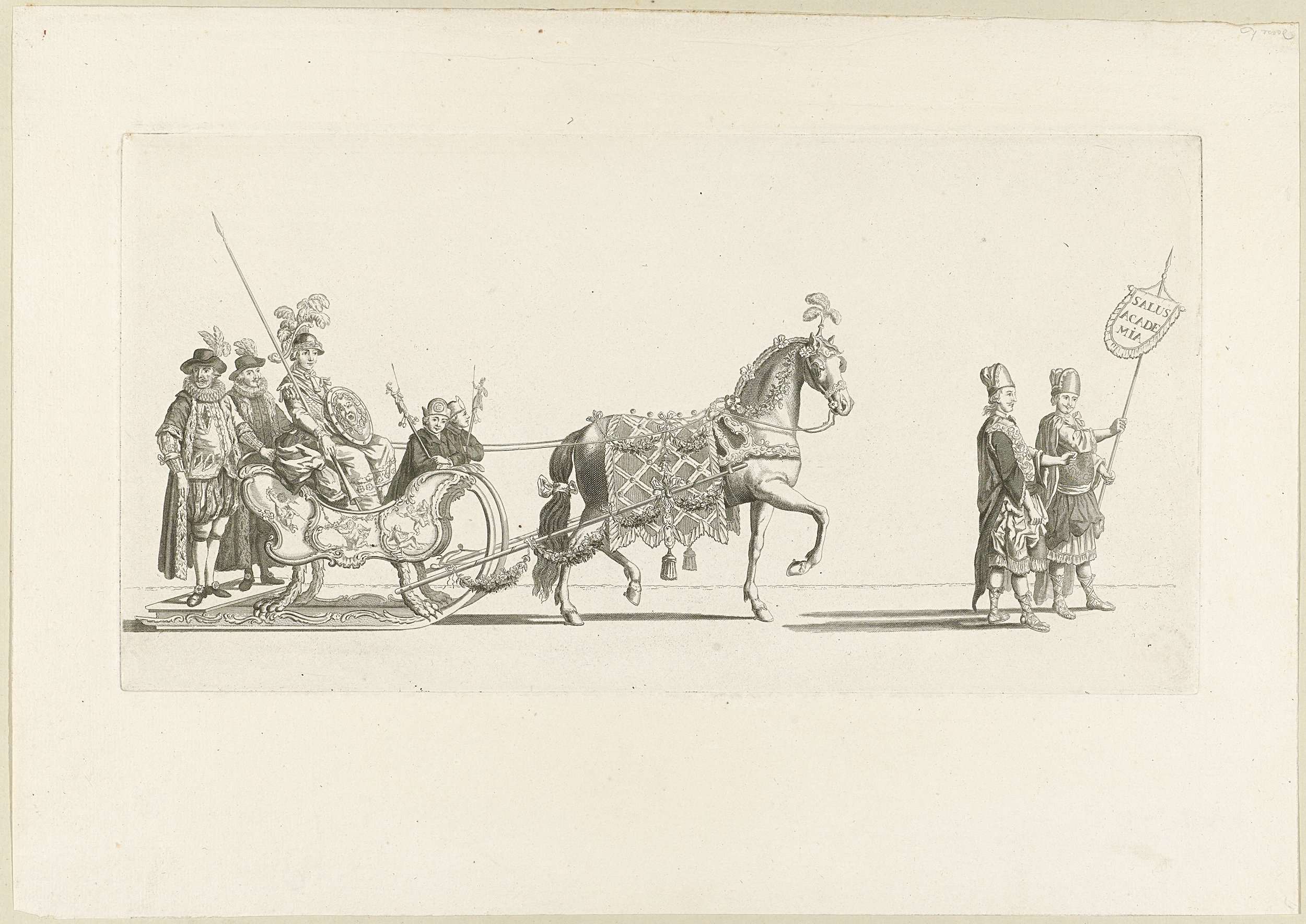 De zevende slede in de optocht. Een slede met Minerva getrokken door een paard en voorafgegaan door twee personen in Griekse kleding. Onderdeel van een reeks van twaalf platen (vóór het nummer en op ander papier) van de sledevaart op 24 januari 1776 georganiseerd door het Leidse genootschap Veniam Pro Laude bij gelegenheid van het ...
