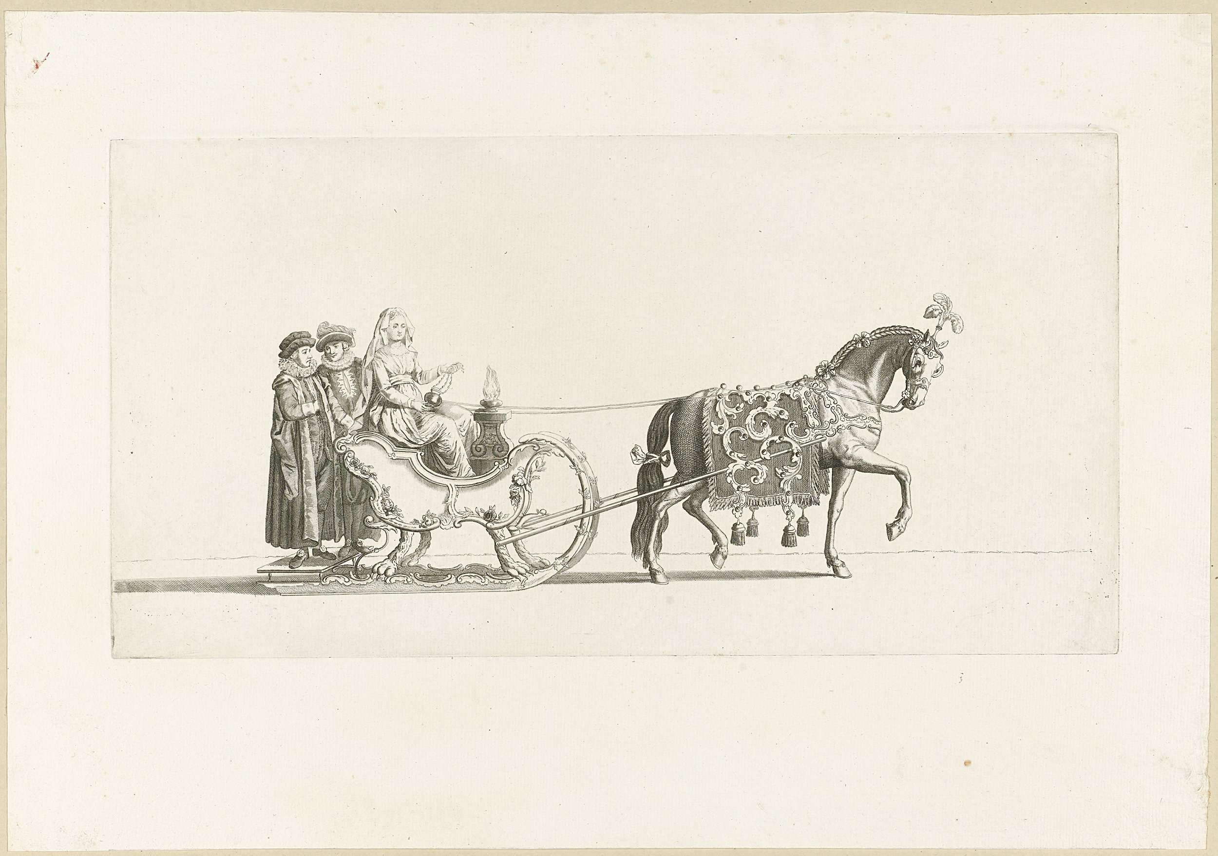 De achtste slede in de optocht. Een slede met de personificatie van de Godsdienst, getrokken door een paard. Onderdeel van een reeks van twaalf platen (vóór het nummer en op ander papier) van de sledevaart op 24 januari 1776 georganiseerd door het Leidse genootschap Veniam Pro Laude bij gelegenheid van het Tweede Eeuwfeest van het ...