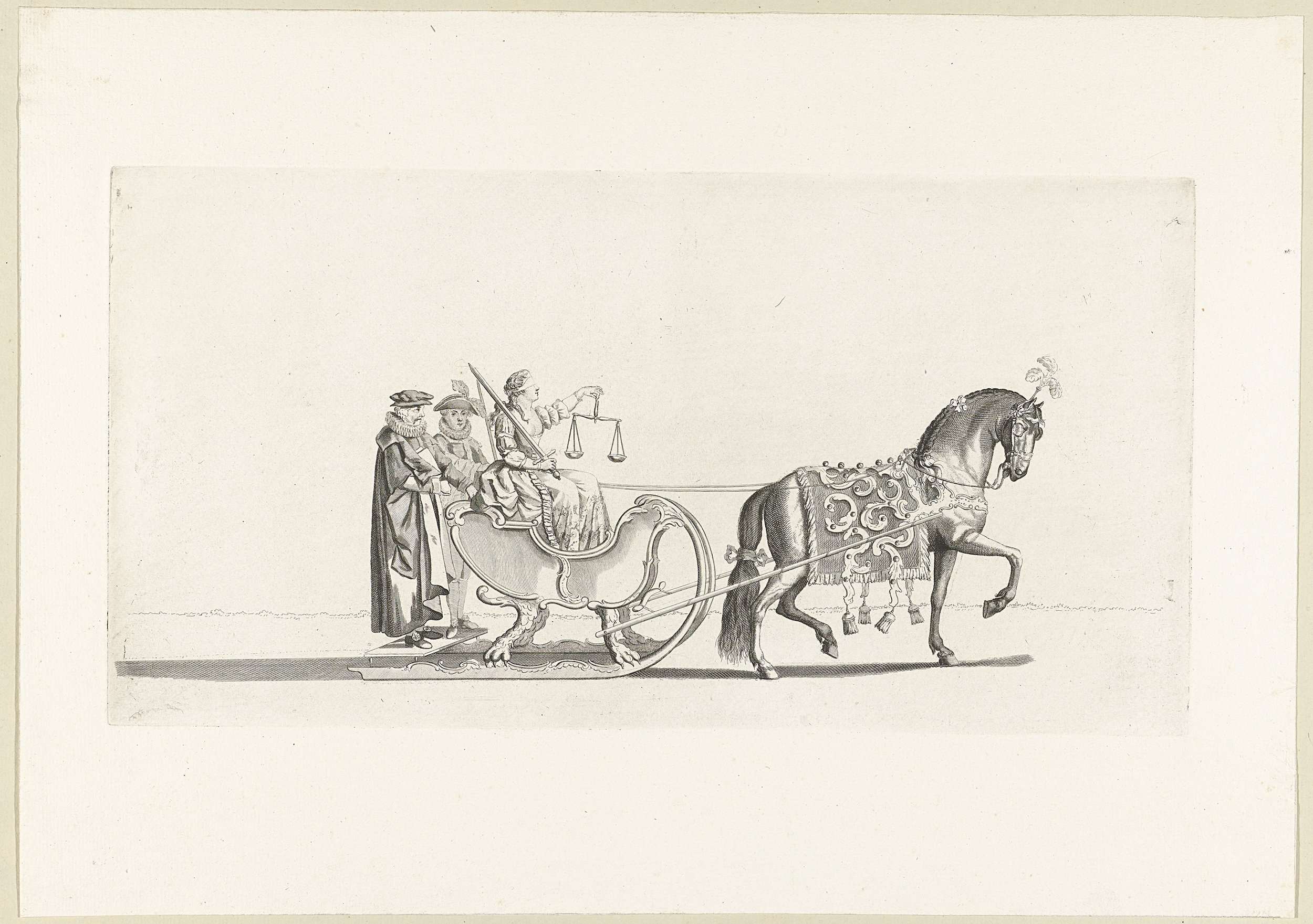 De negende slede in de optocht. Een slede met de personificatie van de Rechtvaardigheid, getrokken door een paard. Onderdeel van een reeks van twaalf platen (vóór het nummer en op ander papier) van de sledevaart op 24 januari 1776 georganiseerd door het Leidse genootschap Veniam Pro Laude bij gelegenheid van het Tweede Eeuwfeest van het ...
