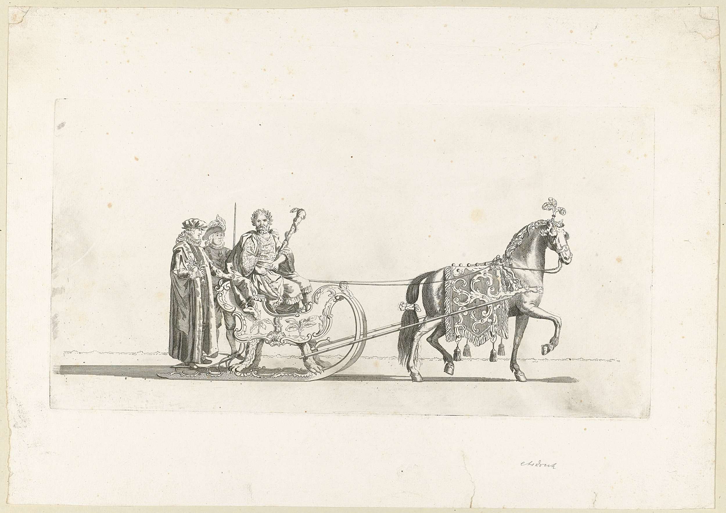De tiende slede in de optocht. Een slede met Asclepius (Aesculapius), getrokken door een paard. Onderdeel van een reeks van twaalf platen (etsdruk vóór het nummer en op ander papier) van de sledevaart op 24 januari 1776 georganiseerd door het Leidse genootschap Veniam Pro Laude bij gelegenheid van het Tweede Eeuwfeest van het Leids Ontzet ...