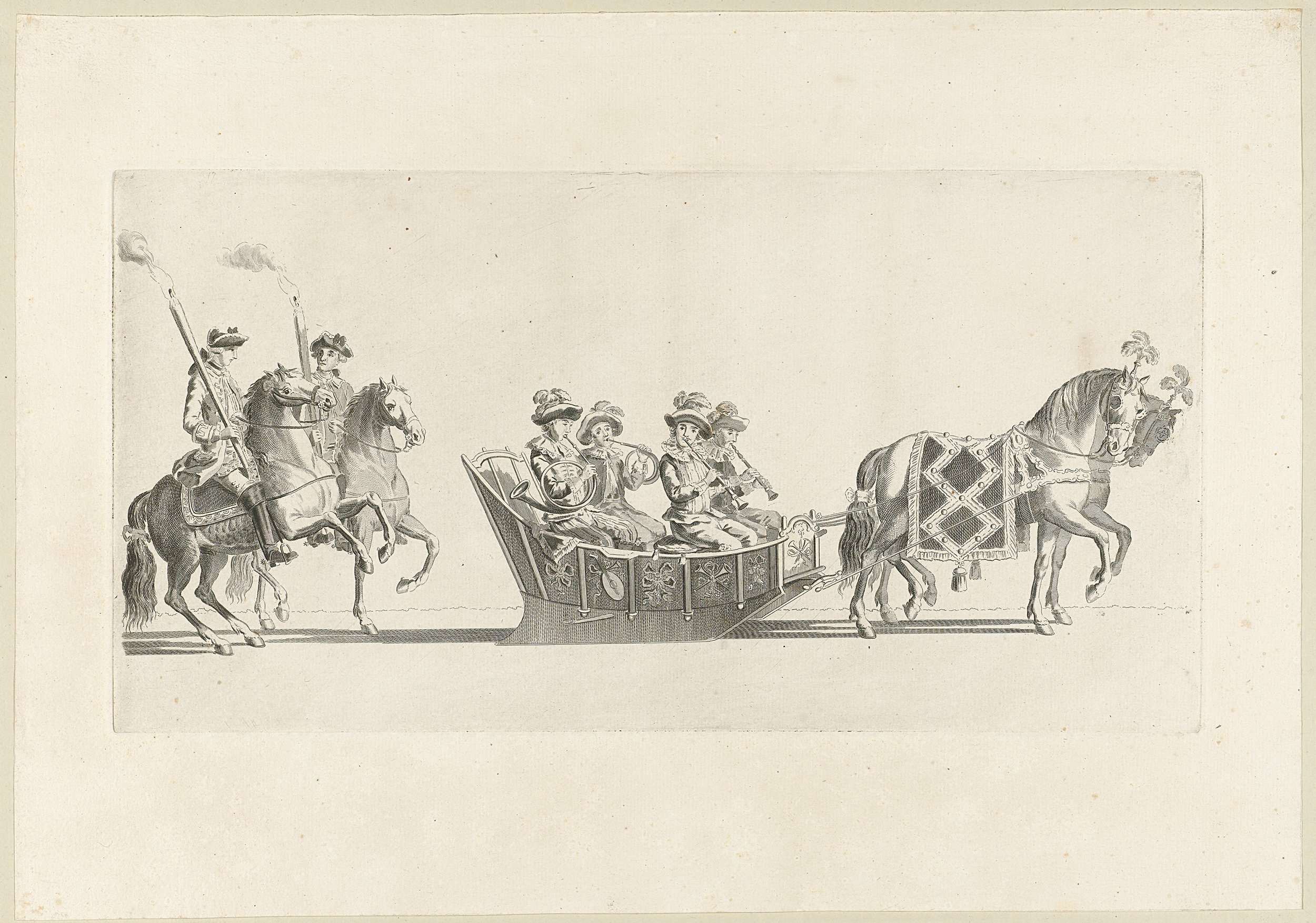 De twaalfde slede in de optocht. Een slede met vier muzikanten, getrokken door een paard, gevolgd door twee ruiters met toortsen. Onderdeel van een reeks van twaalf platen (vóór het nummer en op ander papier) van de sledevaart op 24 januari 1776 georganiseerd door het Leidse genootschap Veniam Pro Laude bij gelegenheid van het Tweede ...