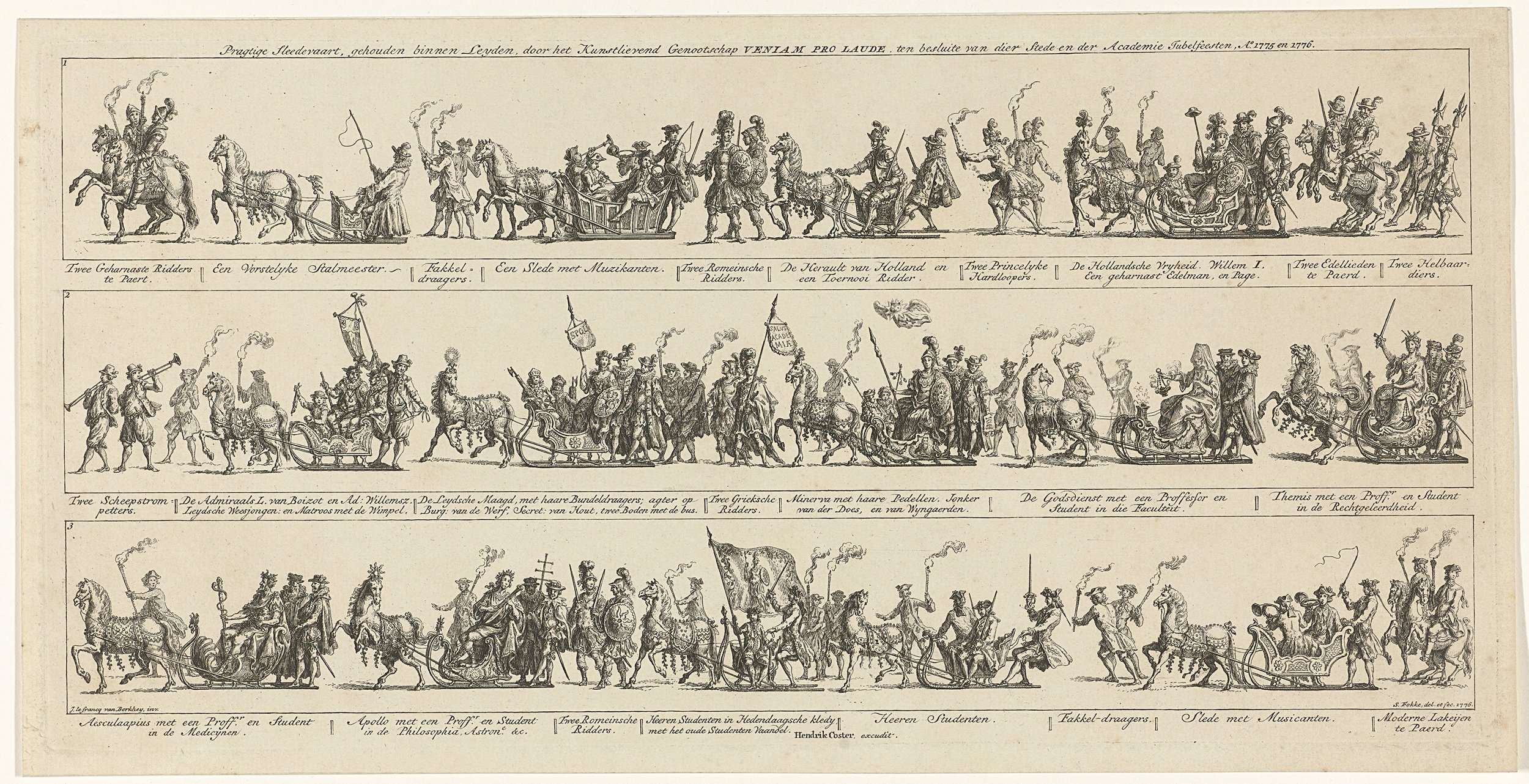 De sledevaart op 24 januari 1776 georganiseerd door het Leidse genootschap Veniam Pro Laude bij gelegenheid van het Tweede Eeuwfeest van het Leids Ontzet (3 oktober 1574) en de oprichting van de Universiteit van Leiden (8 februari 1575). De veertien sleden in drie rijen onder elkaar, genummerd 1-3, met aanduiding van het onderwerp van de ...