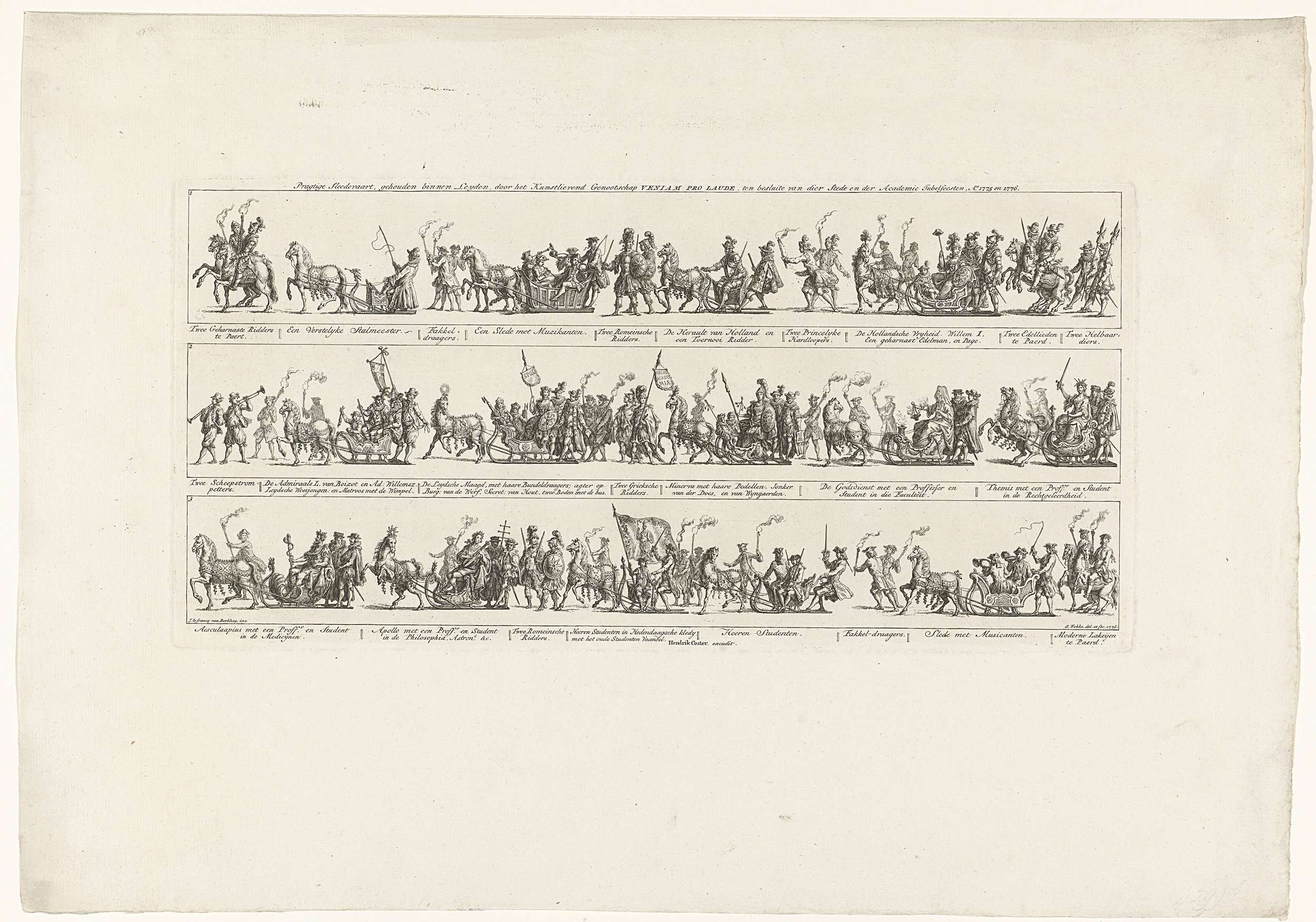 De sledevaart op 24 januari 1776 georganiseerd door het Leidse genootschap Veniam Pro Laude bij gelegenheid van het Tweede Eeuwfeest van het Leids Ontzet (3 oktober 1574) en de oprichting van de Universiteit van Leiden (8 februari 1575). De veertien sleden in drie rijen onder elkaar, genummerd 1-3, met aanduiding van het onderwerp van de ...