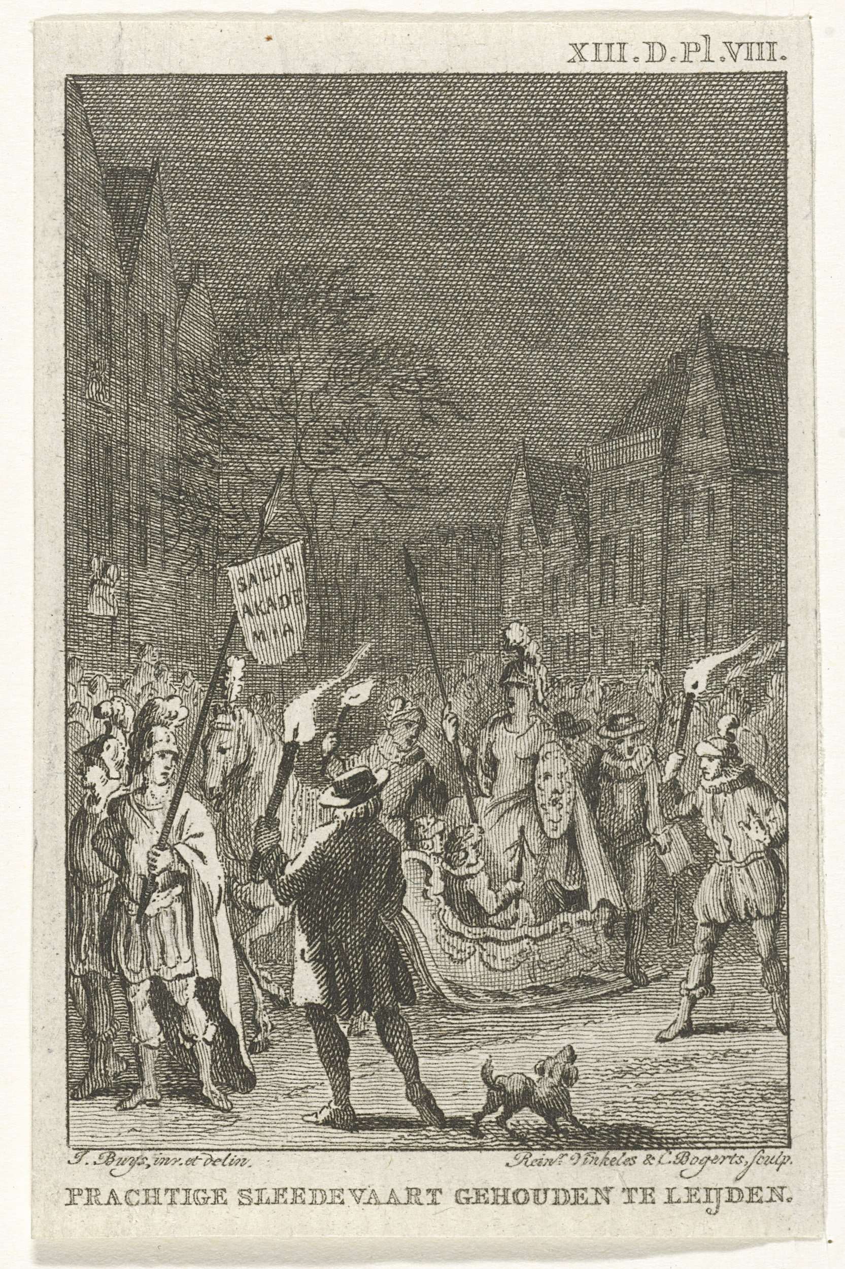 De sledevaart op 24 januari 1776 georganiseerd door het Leidse genootschap Veniam Pro Laude bij gelegenheid van het Tweede Eeuwfeest van het Leids Ontzet (3 oktober 1574) en de oprichting van de Universiteit van Leiden (8 februari 1575). Gemerkt rechtsboven: XIII.D.Pl.VIII.