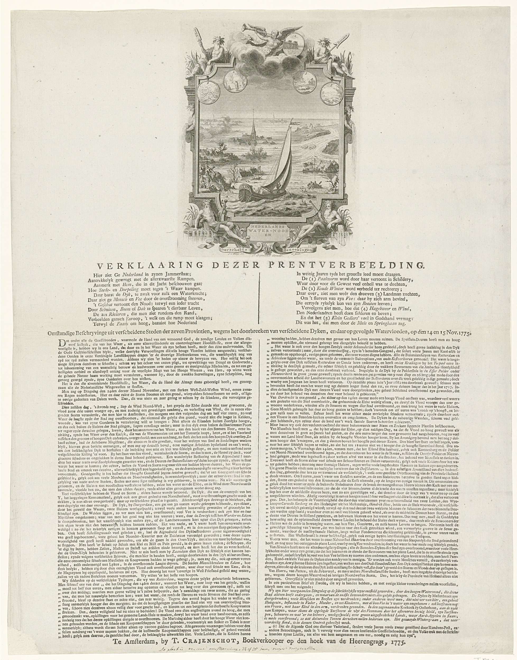 Allegorische plaat over Nederland getroffen door de watersnood van 14-18 november 1775 en andere rampen in dit jaar. Centraal een jacht die over het overstroomd land en langs verdronken dorpen zeilt tijdens de watersnood. Bovenaan vijf medaillons met verwijzingen naar andere rampen als paalworm, strenge winter etc. In allegorische omlijsting met de Faam en vier ...