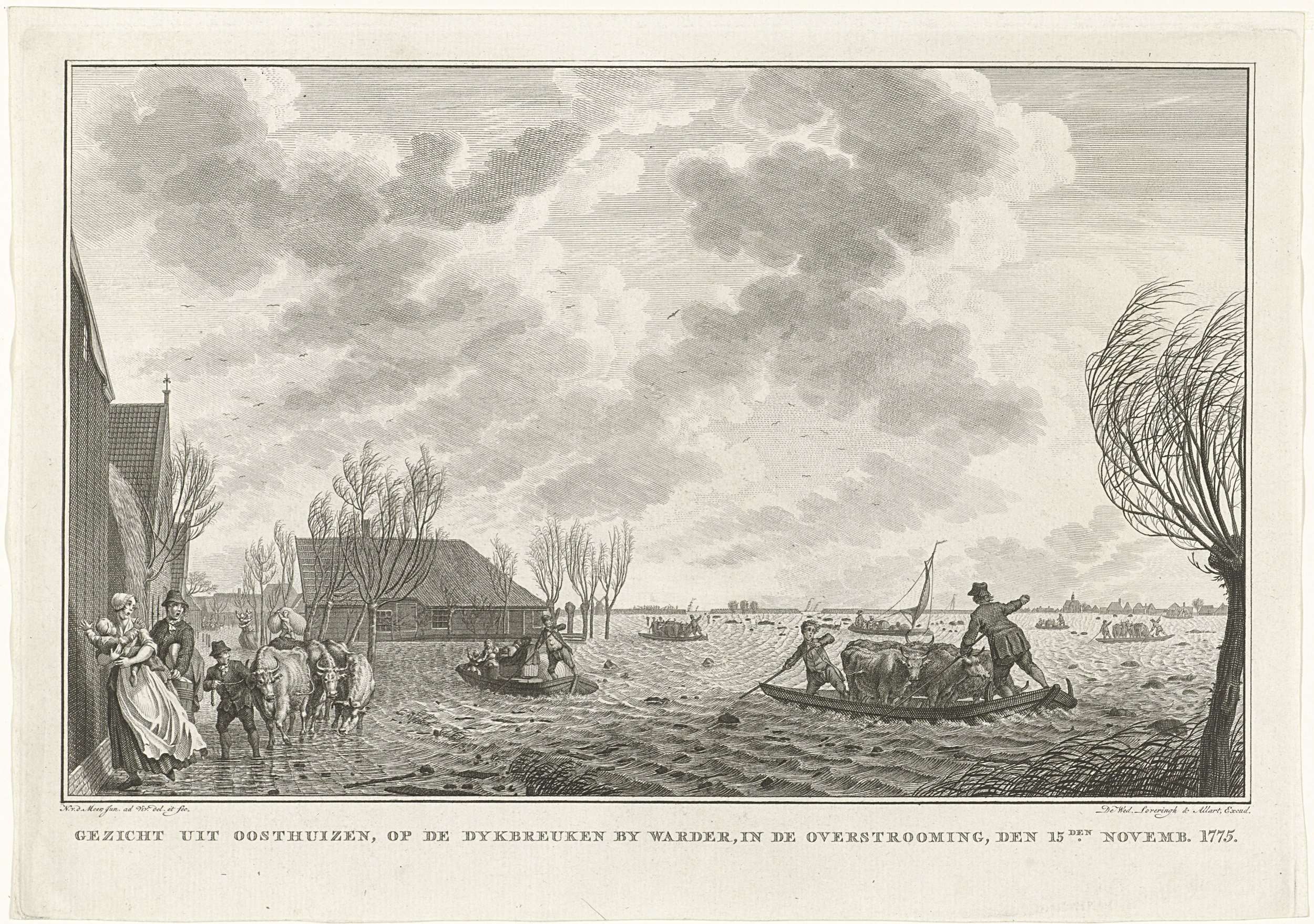 Het dorp Oosthuizen getroffen door overstromingen na de dijkdoorbraak bij Warder op 15 november 1775. Bewoners proberen in schuiten huisraad en dieren te redden. Onderdeel van een groep illustraties van de overstromingen in 1775.