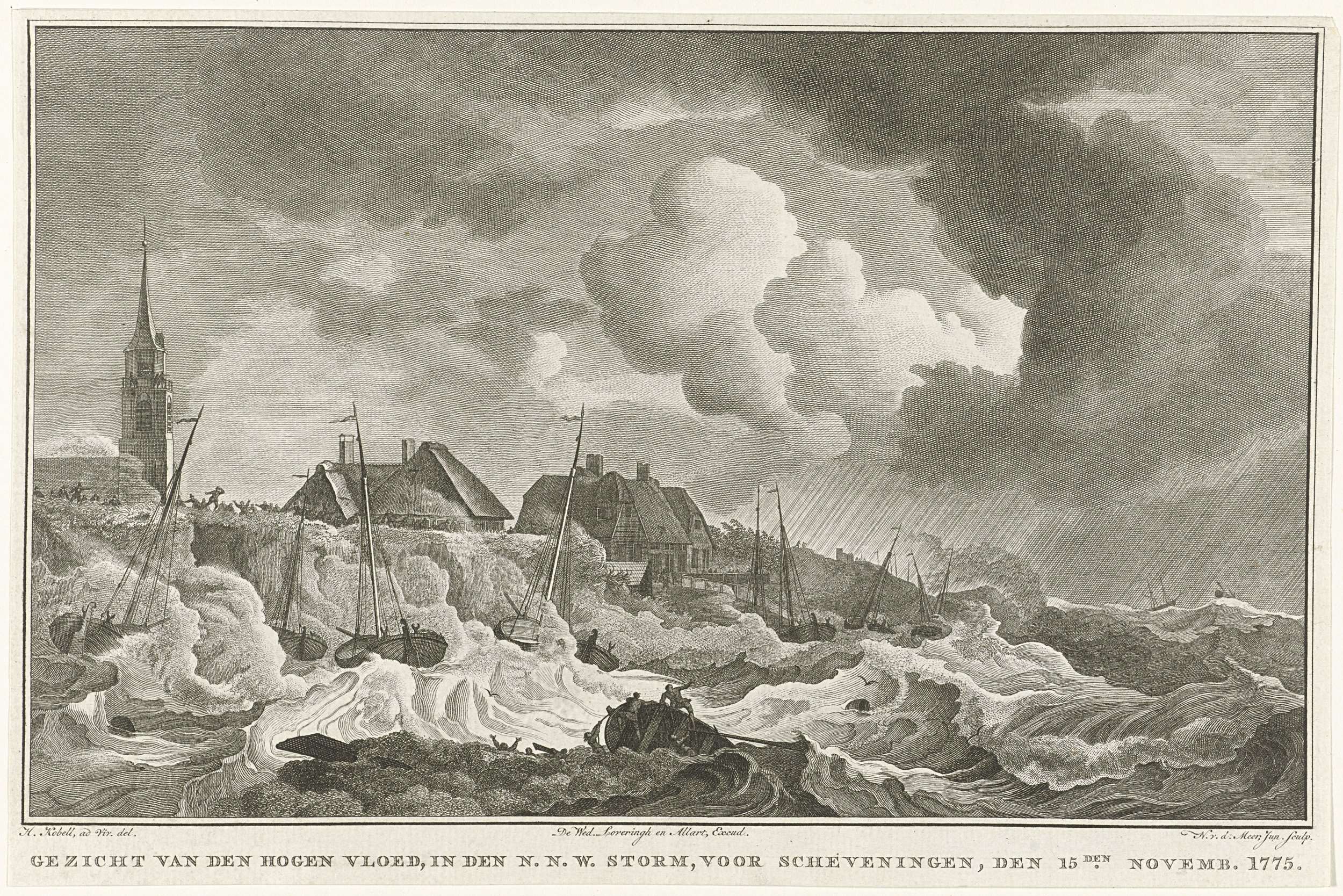 Noordwesterstorm voor de kust bij Scheveningen. Vissersboten vergaan in de branding en worden tegen de duinen gedreven. Onderdeel van een groep illustraties van de overstromingen in 1775.