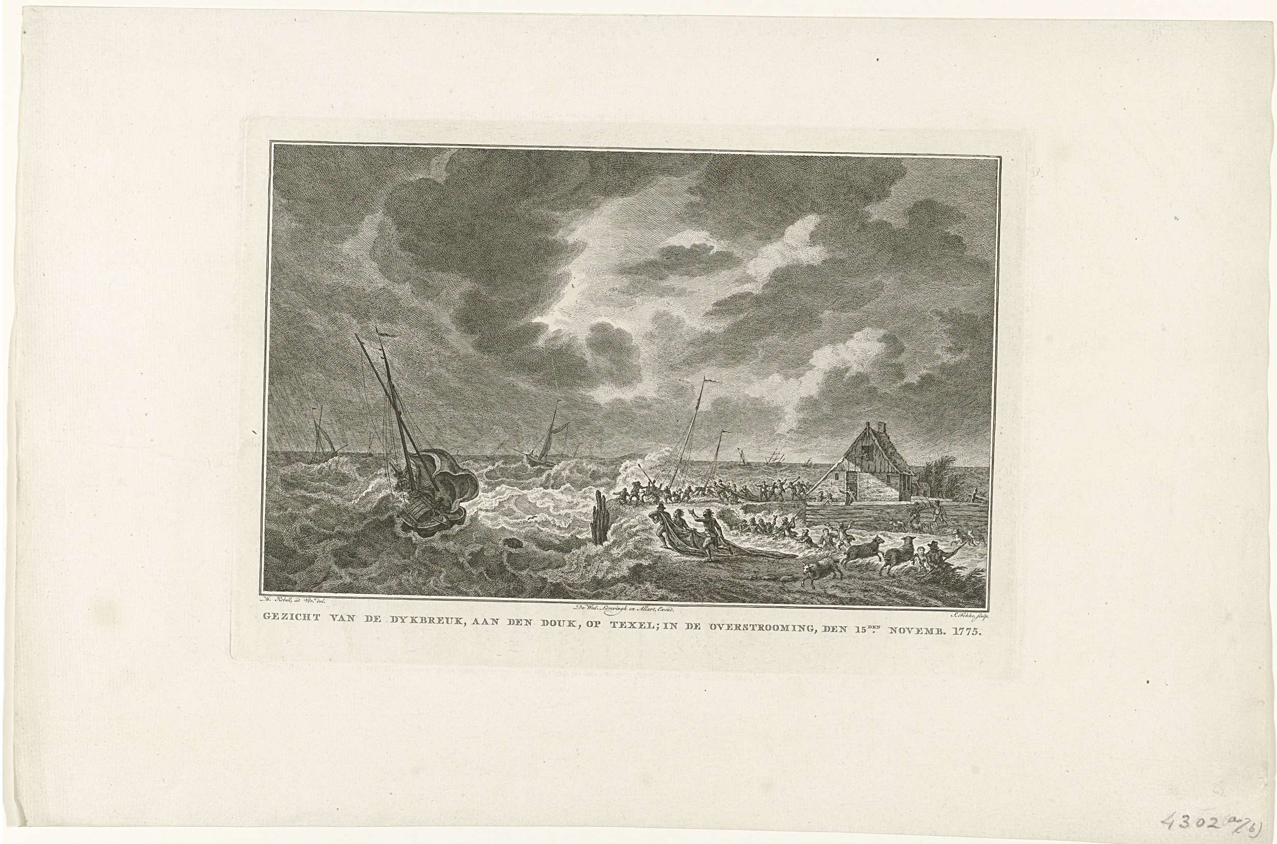 Dijkdoorbraak bij Den Doel aan de kust van Texel. Onderdeel van een groep illustraties van de overstromingen in 1775.