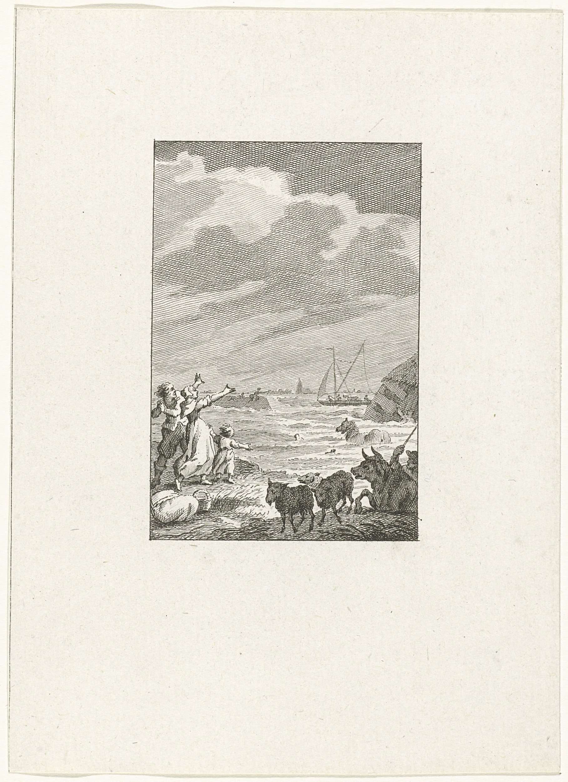 De watersnood van 14-18 november 1775. Een wanhopige familie met huisraad en vee staande aan de oever van het overstroomde gebied.