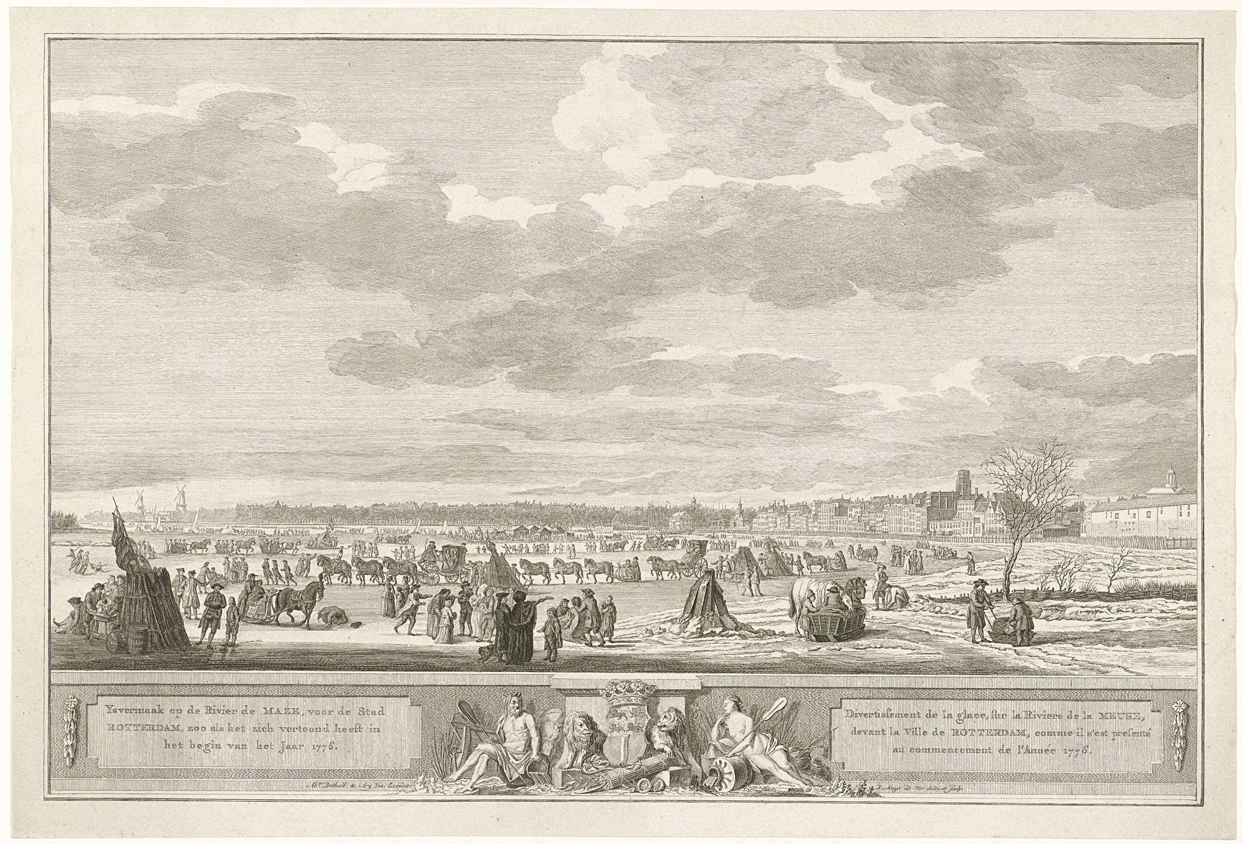 Weids gezicht op de bevroren rivier de Maas te Rotterdam aan het begin van 1776 met allerlei vormen van ijsvermaak. Landschap ten zuiden van de Oude-Hoofdpoort, langs de huizen van het Haringvliet, met rijtuigen op het ijs, schaatsen, sledes, koek en zopie etc. Onderaan de titels in het Nederlands en Frans ter weerszijden van een ...