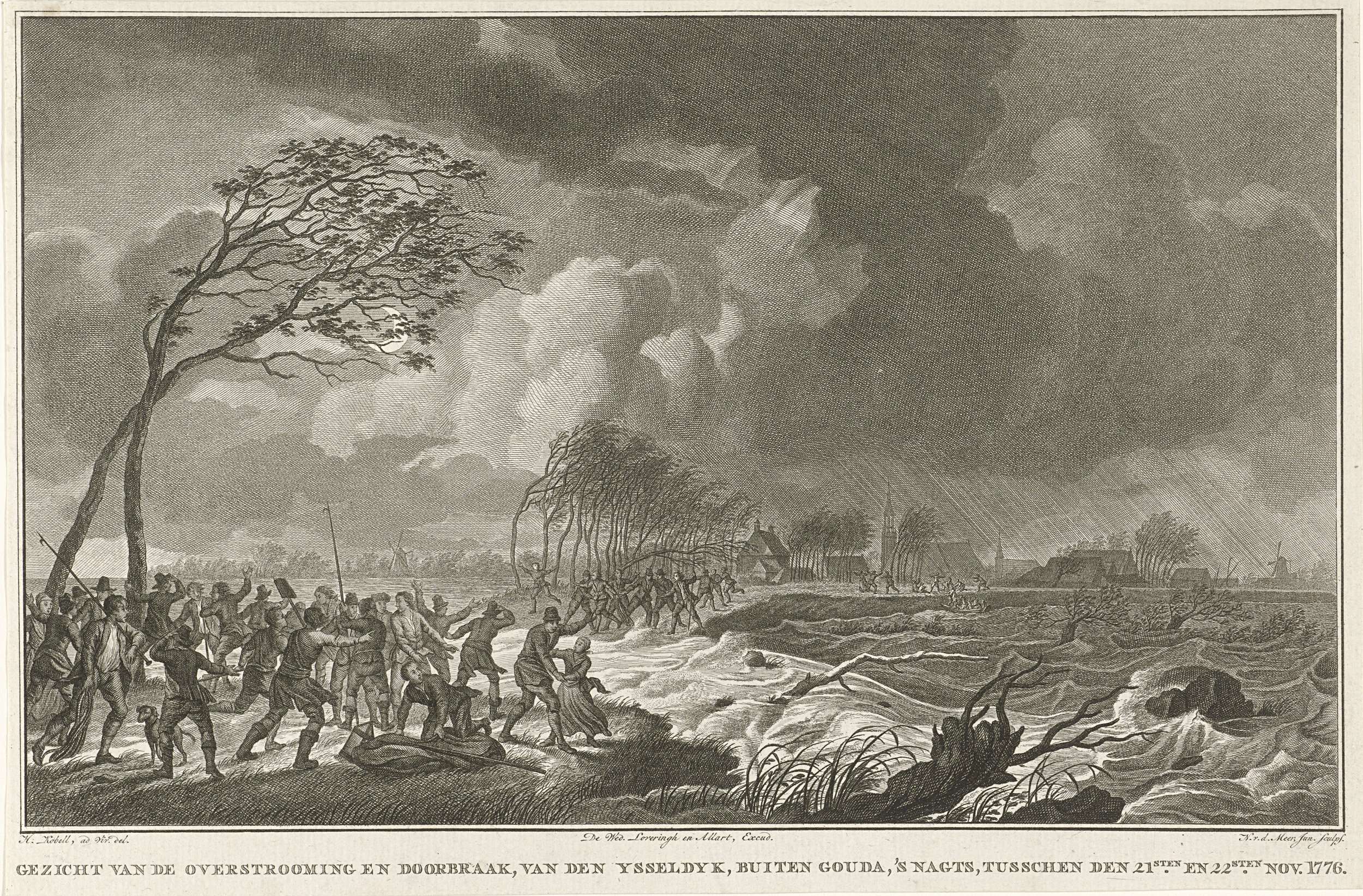 Doorbraak van de IJsseldijk bij Gouda in de nacht van 21 op 22 november 1776. Aan weerszijden van het gat in de dijk staan mensen in paniek. Op de achtergrond regen boven de stad Gouda. Onderdeel van een groep illustraties van de watersnood in 1776.