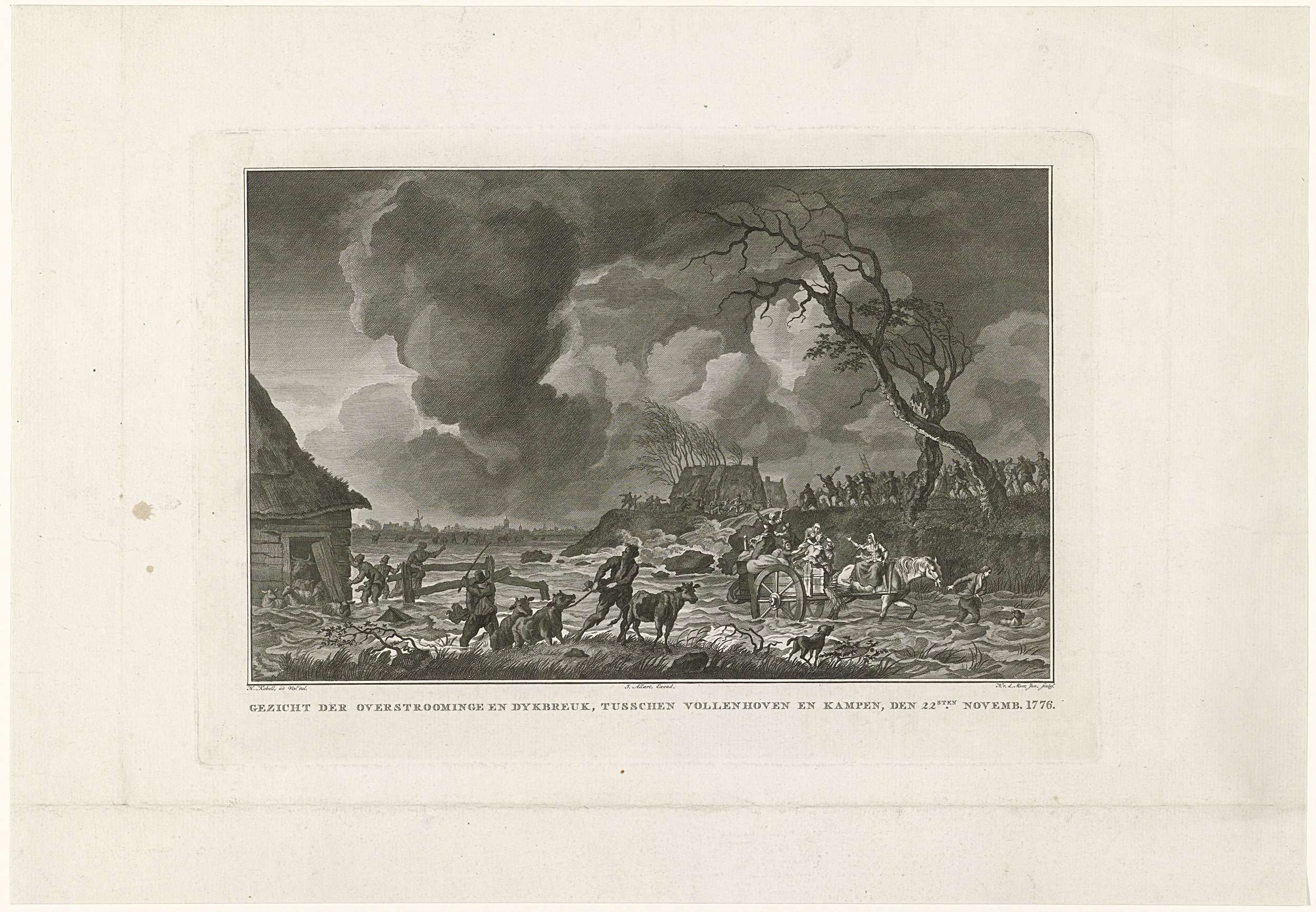 Watersnood bij de dijkdoorbraak tussen de plaatsen Vollenhove en Kampen op 22 november 1776. Een menigte op de dijk probeert het gat te dichten, op de voorgrond vluchten boeren met huisraad en vee uit de ondergelopen boerderijen. Onderdeel van een groep illustraties van de watersnood in 1776.