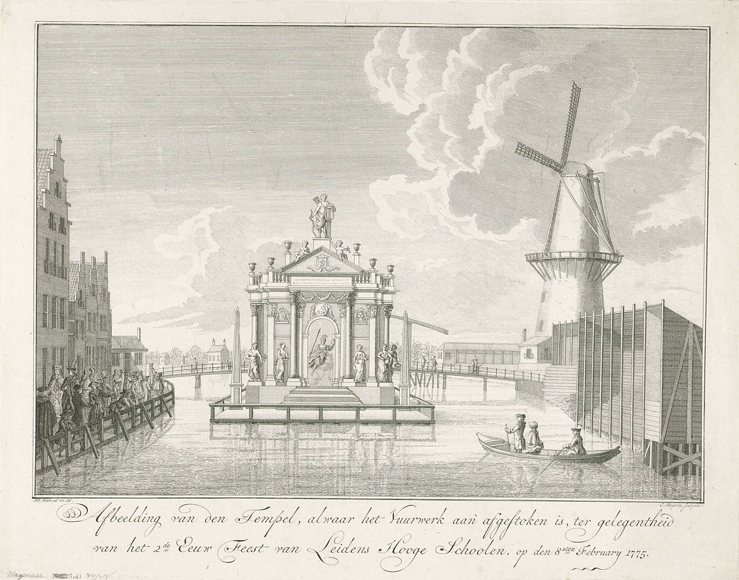 Stellage voor het afsteken van het vuurwerk ter gelegenheid van het Tweede Eeuwfeest van de oprichting van de Universiteit van Leiden, 8 februari 1775. Podium in de vorm van een tempel versierd met allegorische figuren, opgebouwd in het water van de Oude Rijn, rechts een tribune voor het publiek en een windmolen.