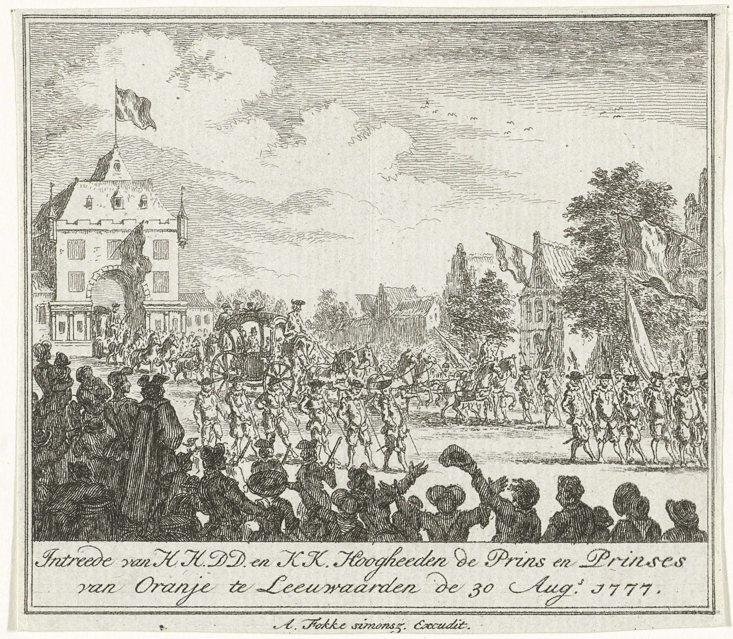 De intrede van de prins Willem V prinses Wilhelmina van Pruisen te Leeuwarden, 30 augustus 1777.