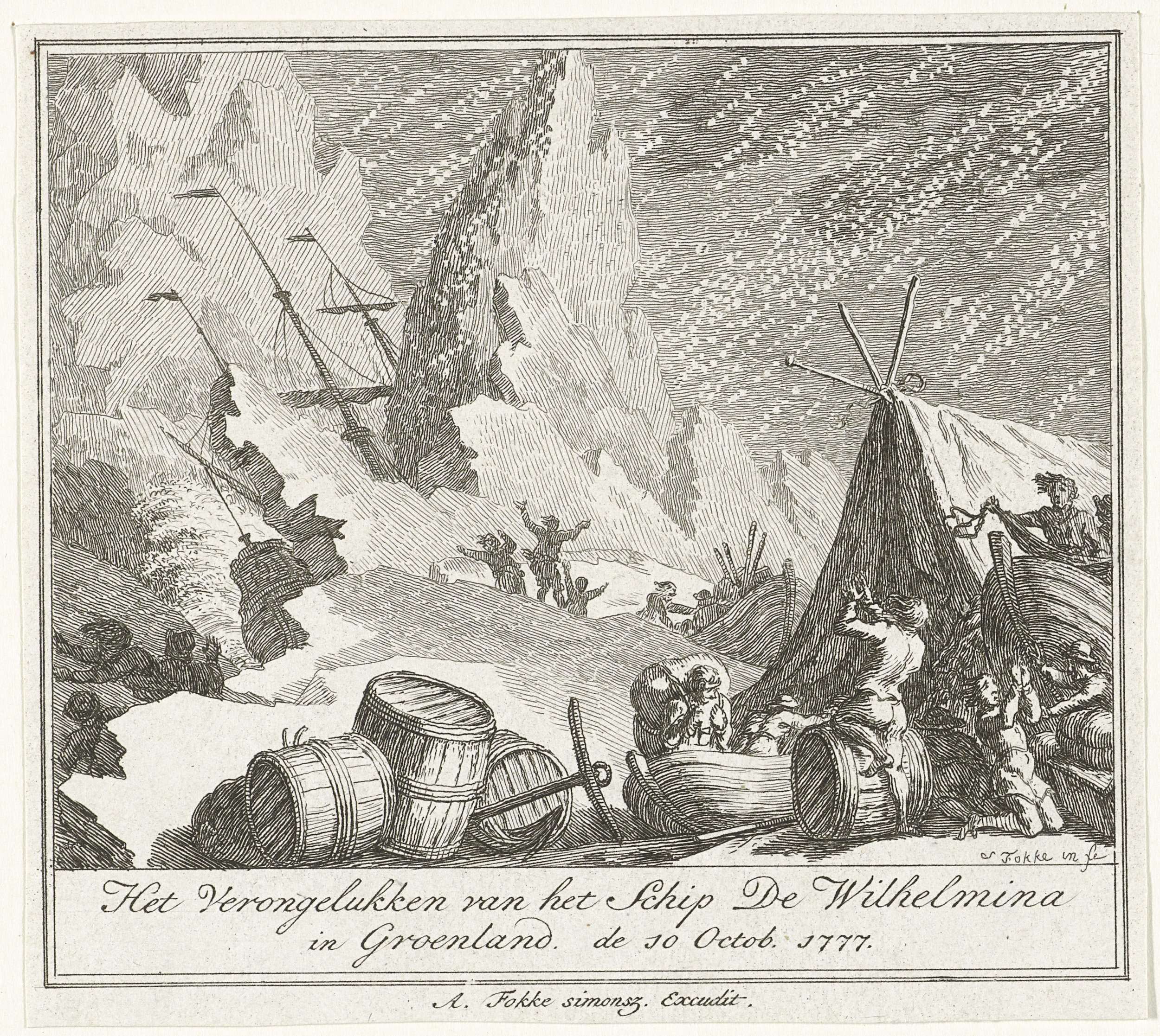 De schipbreuk van het schip de Wilhelmina in Groenland op 10 oktober 1777. De gestrande bemanning redt voorraden en zet in de sneeuw een tent op.
