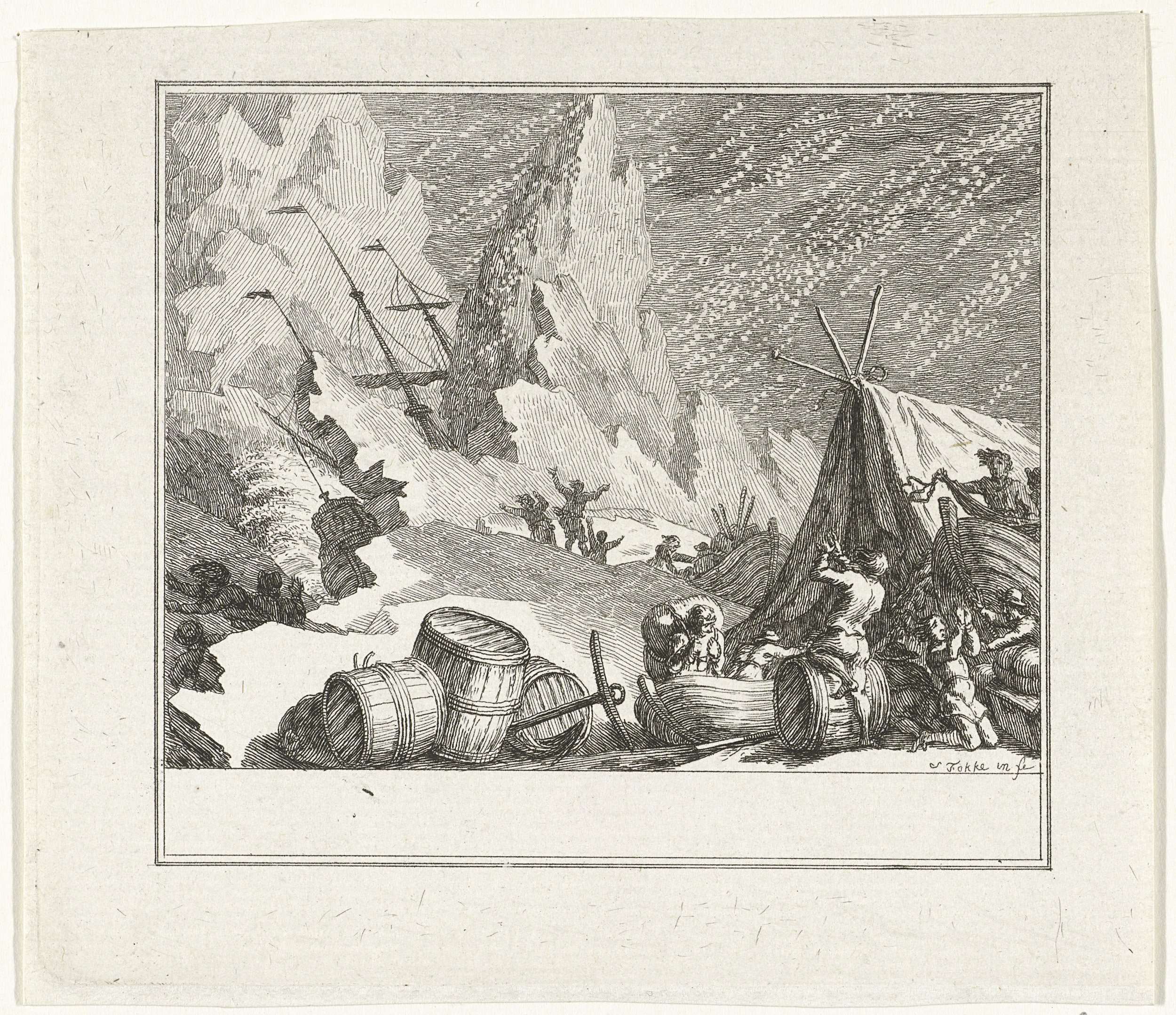 De schipbreuk van het schip de Wilhelmina in Groenland op 10 oktober 1777. De gestrande bemanning redt voorraden en zet in de sneeuw een tent op.